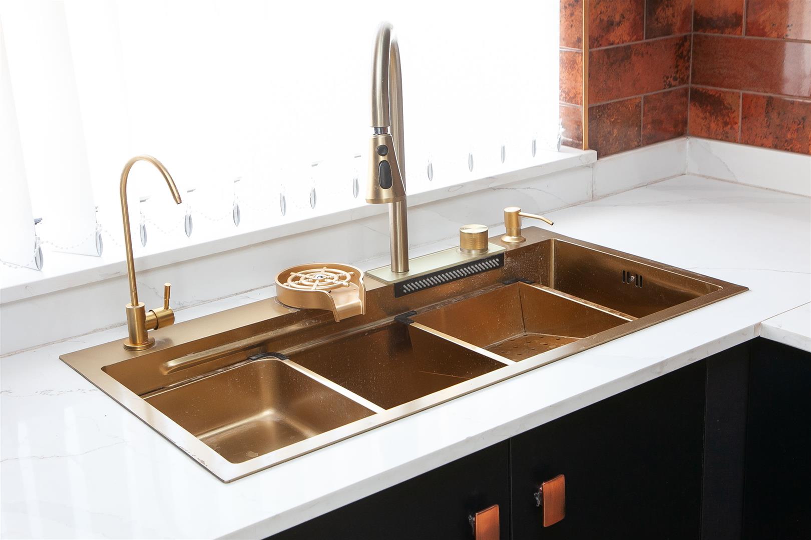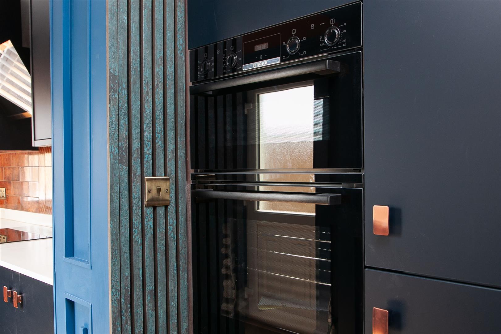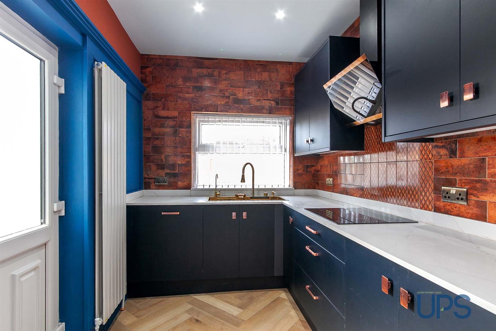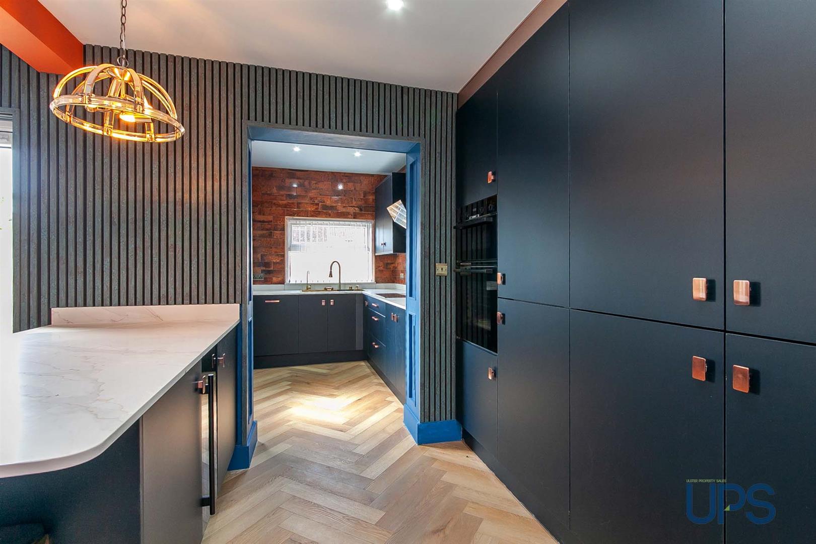 Newly installed range of high and low level units, granite work tops, breakfast bar, integrated appliances, Bosch Hob & Oven, Wine fridge, overhead canopy, feature Gold effect sink unit with glass washer, feature taps. Tiling and flooring.