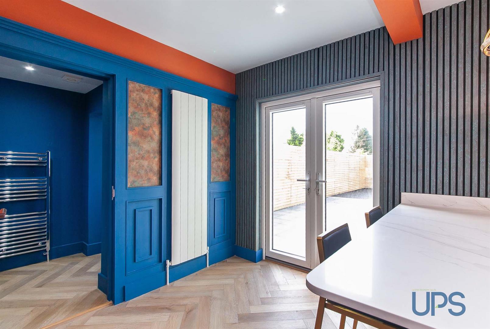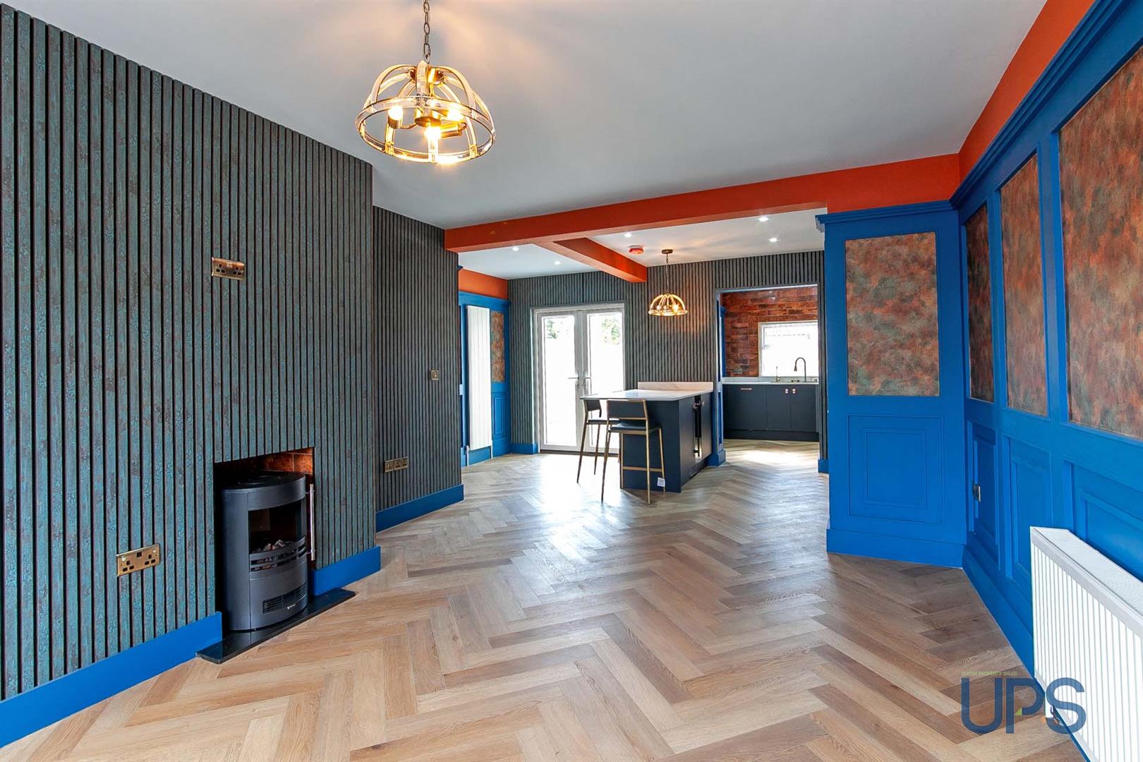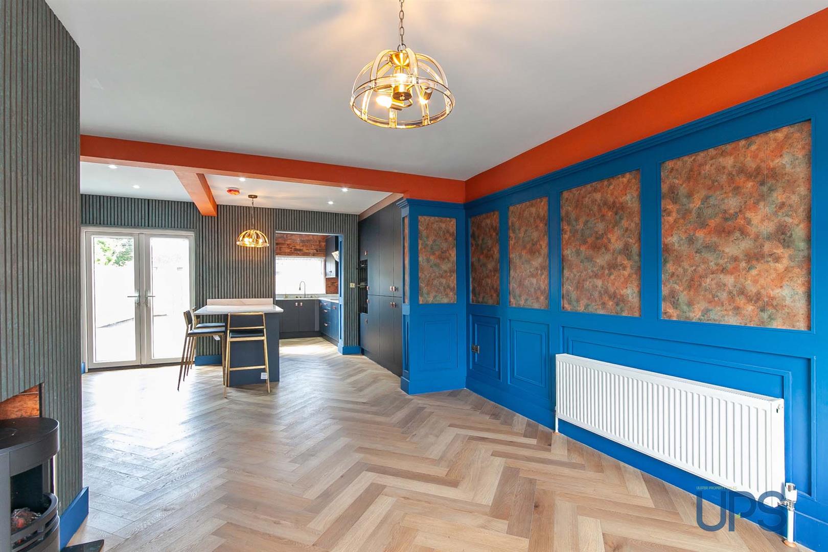 Feature wall paneling, Herringbone flooring, contemporary fireplace / burner with cast iron inset, vertical radiators, Upvc double glazed double patio doors, open to;