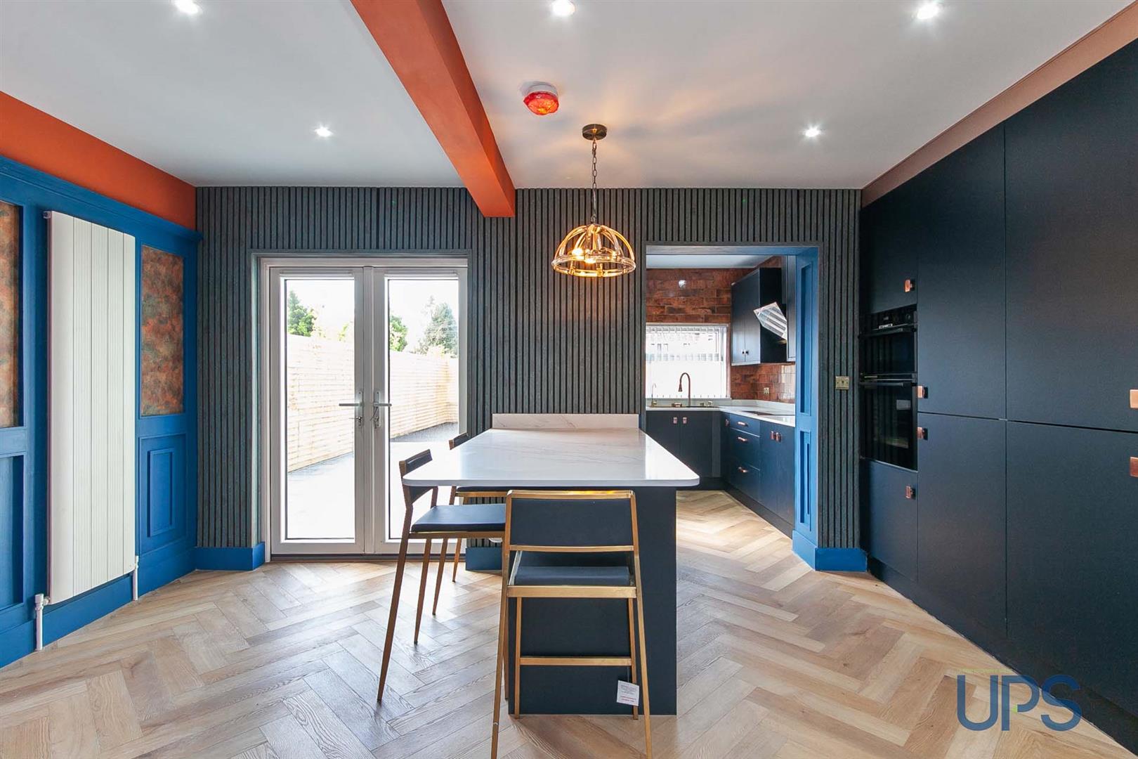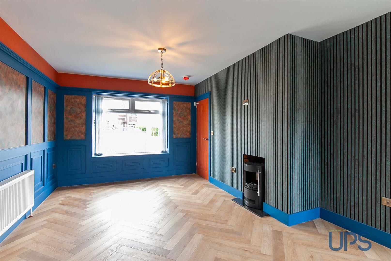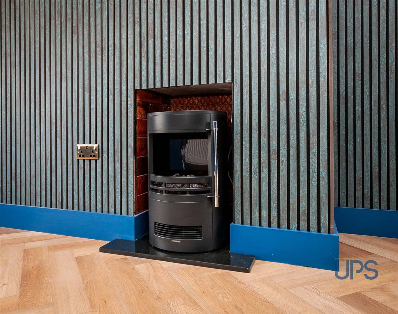 Feature wall paneling, Herringbone flooring, contemporary fireplace / burner with cast iron inset, vertical radiators, Upvc double glazed double patio doors, open to;