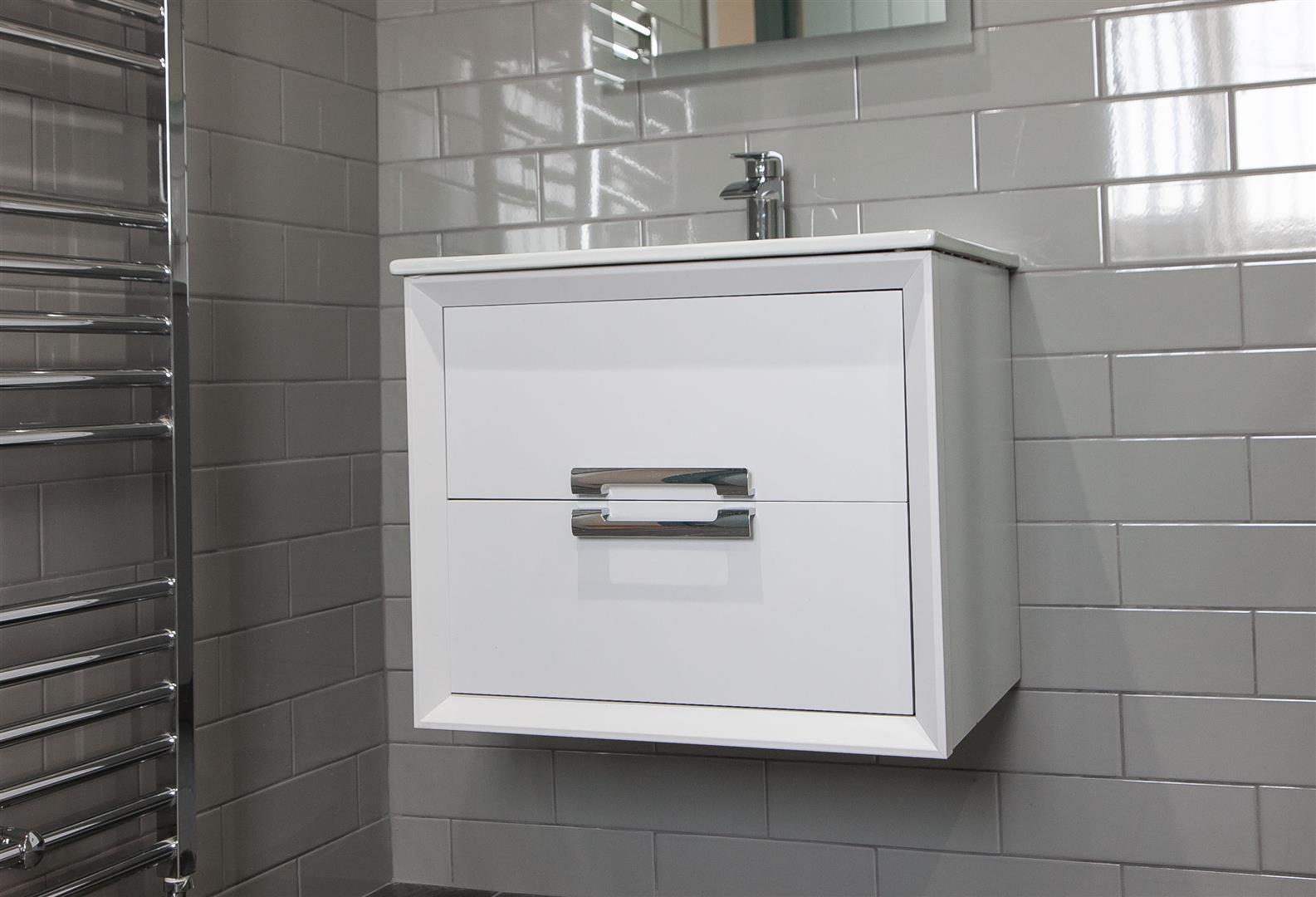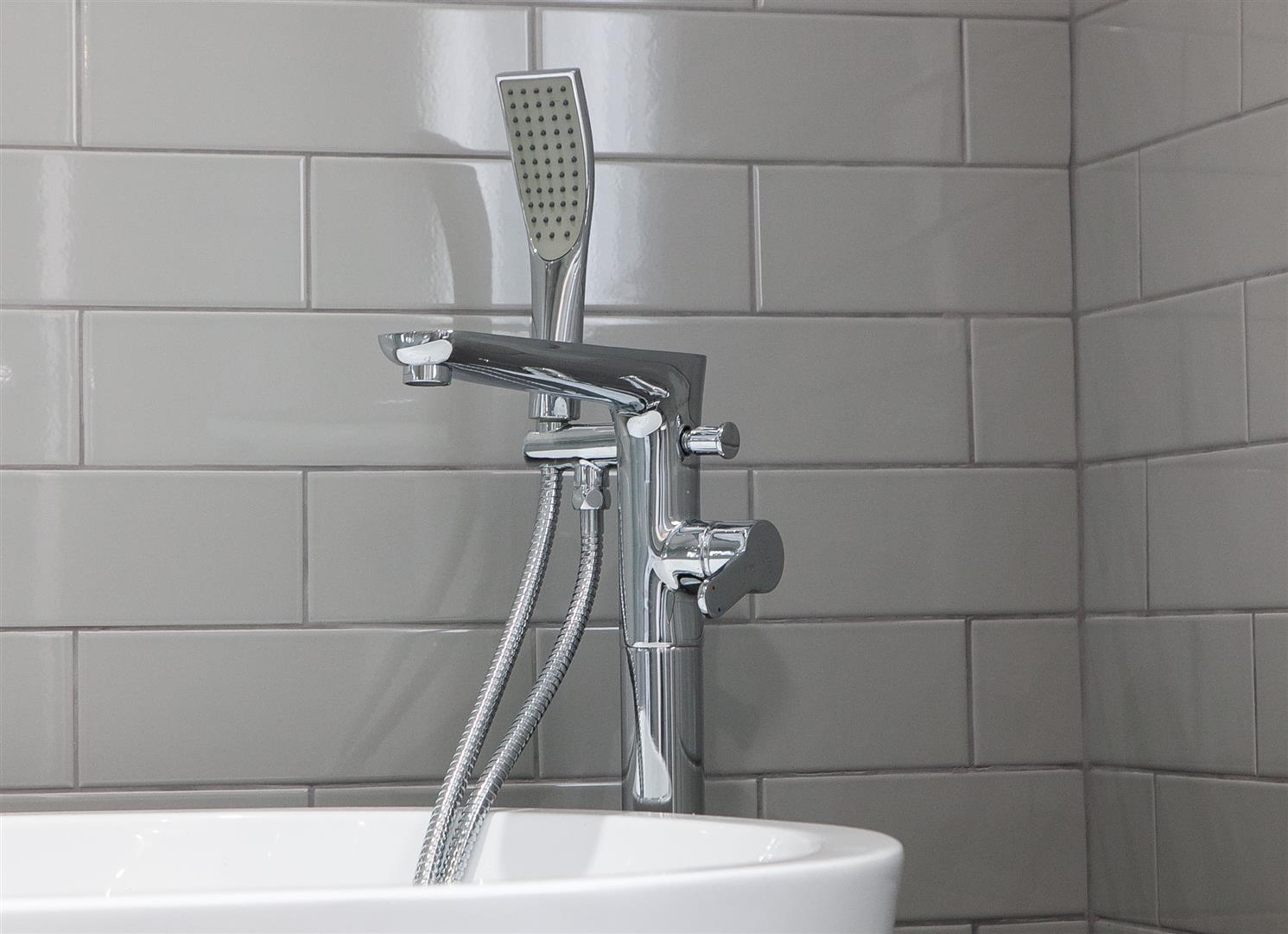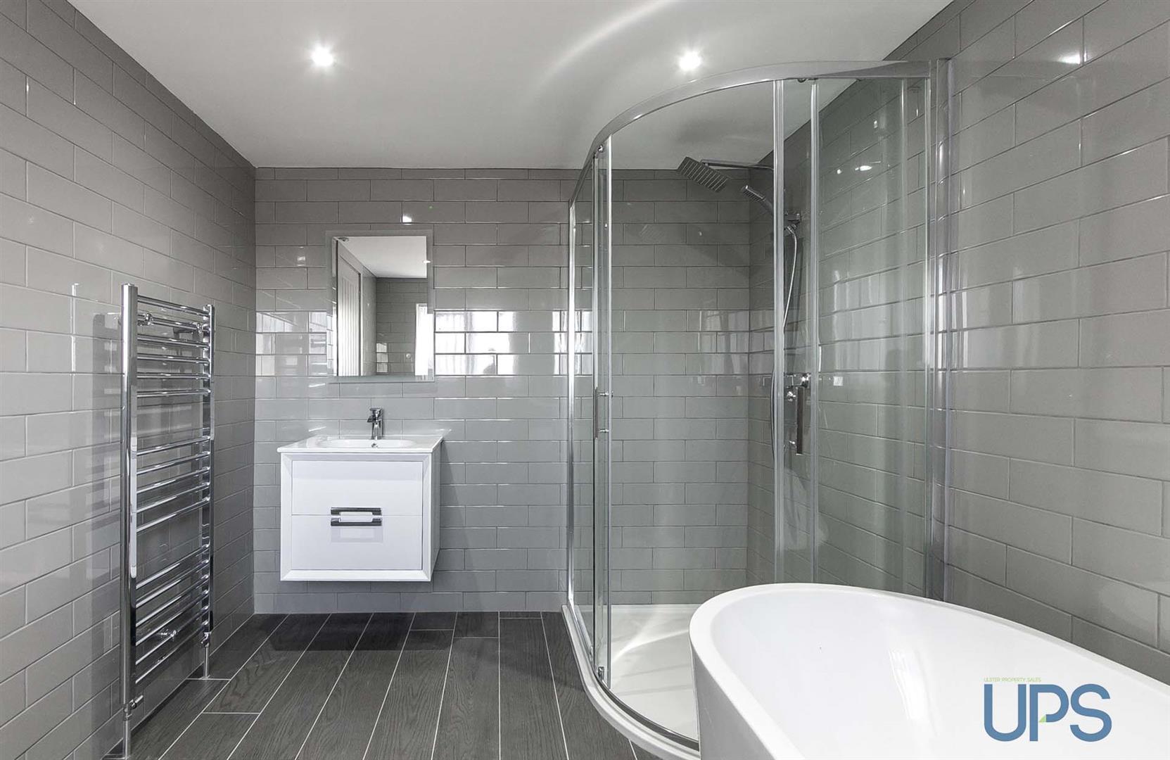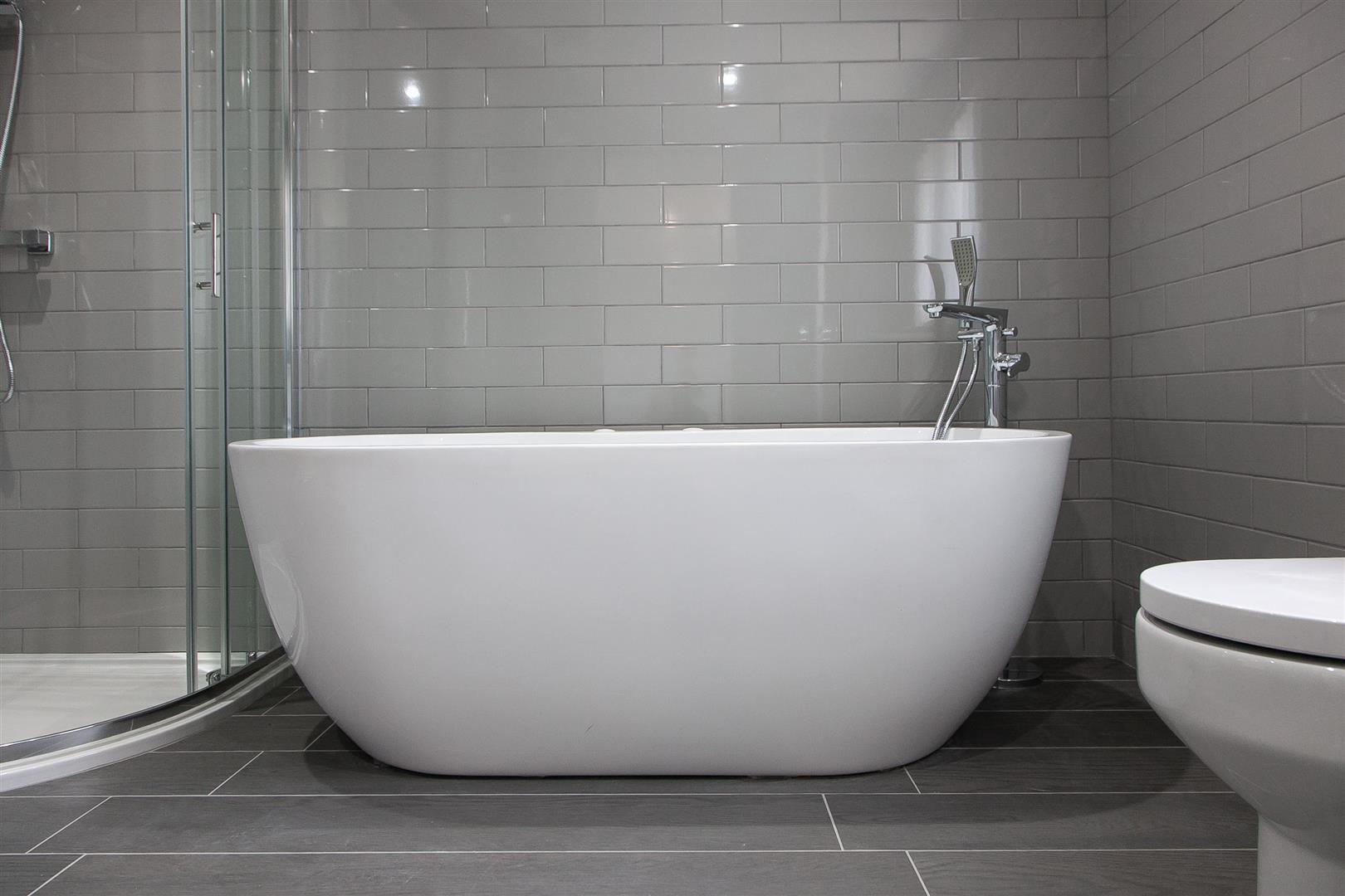 Contemporary white suite, roll top bath, separate shower cubicle, wash hand basin, low flush w.c, tiling, vertical radiator. Feature tiling and flooring.