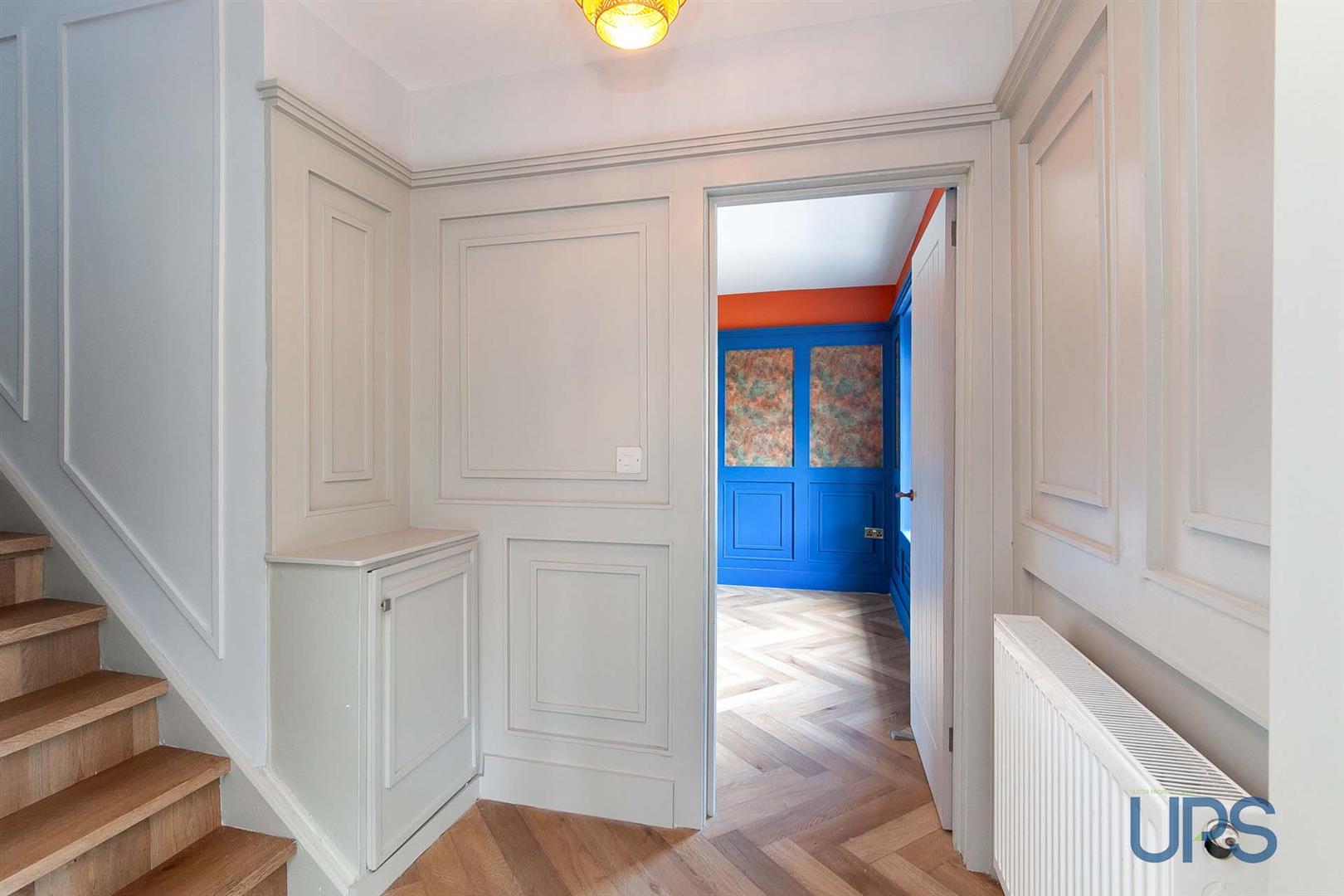 Cloakroom / storage, Herringbone wood effect floor. Feature Paneling, internal doors to :