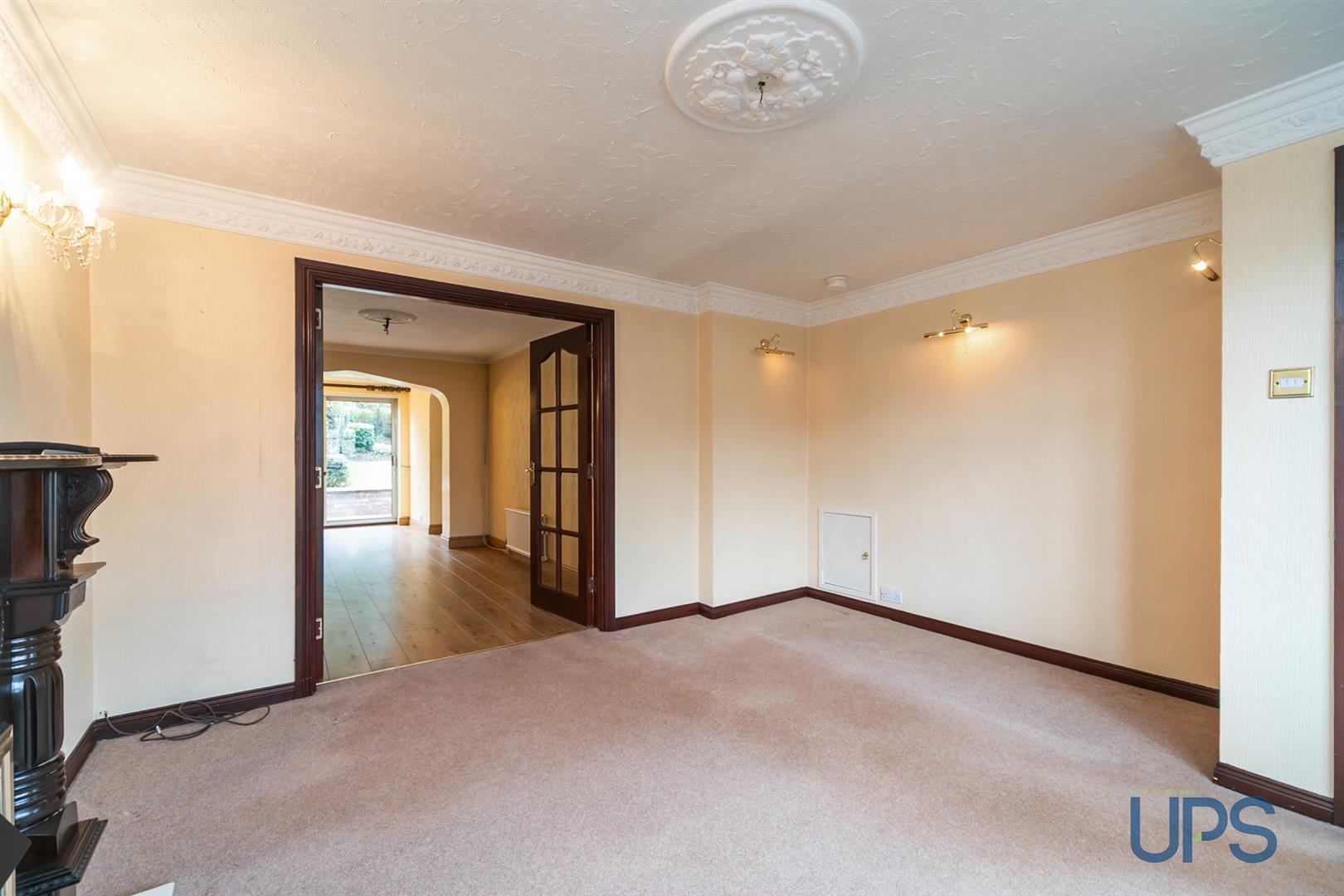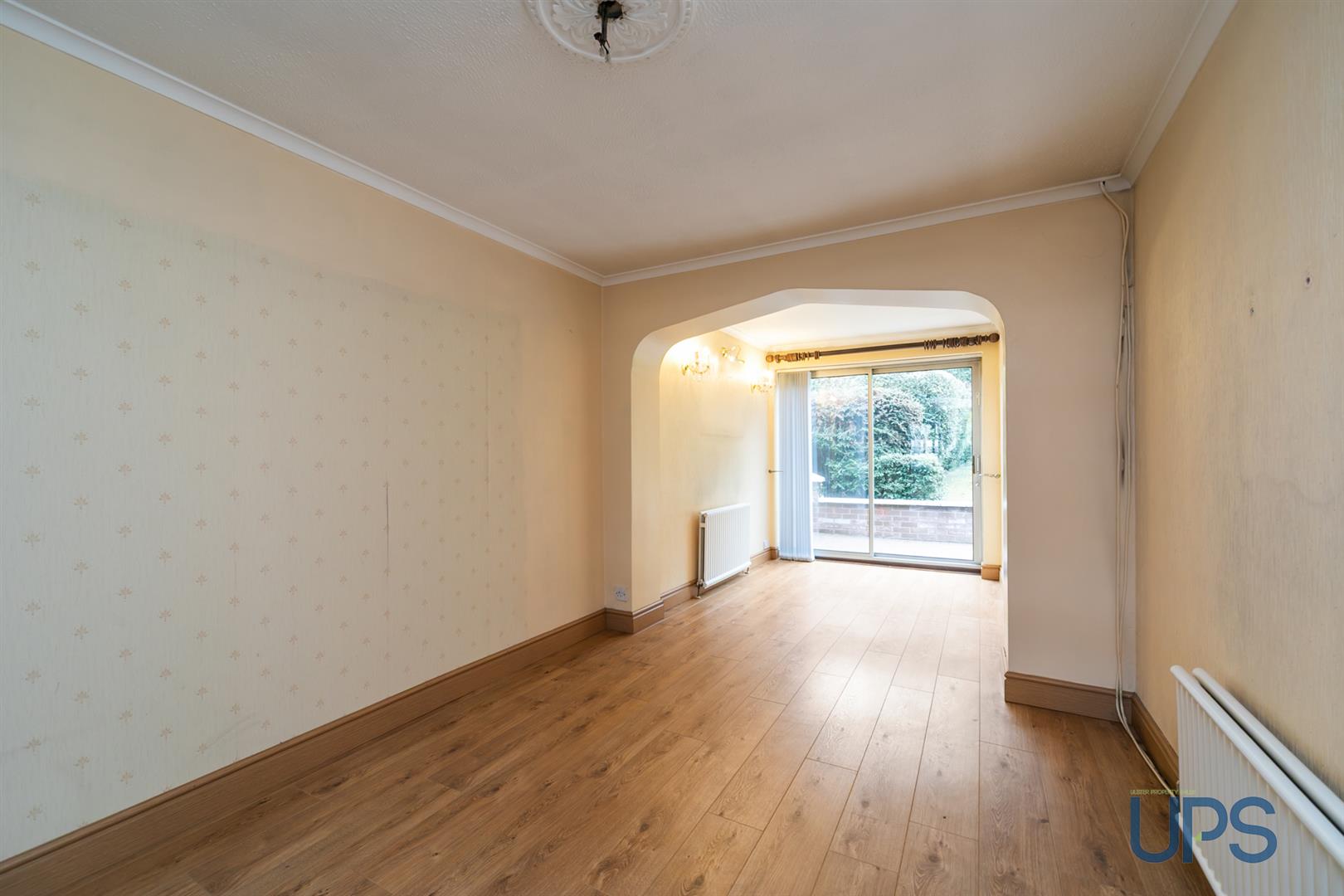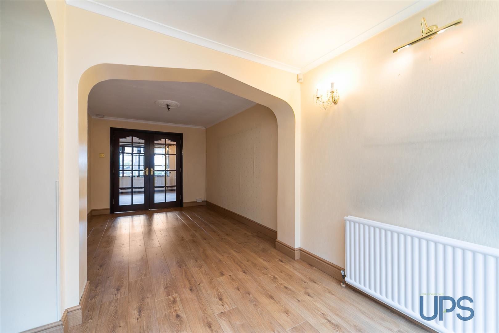 Wooden effect flooring. Double glazed sliding patio doors. Archway to: