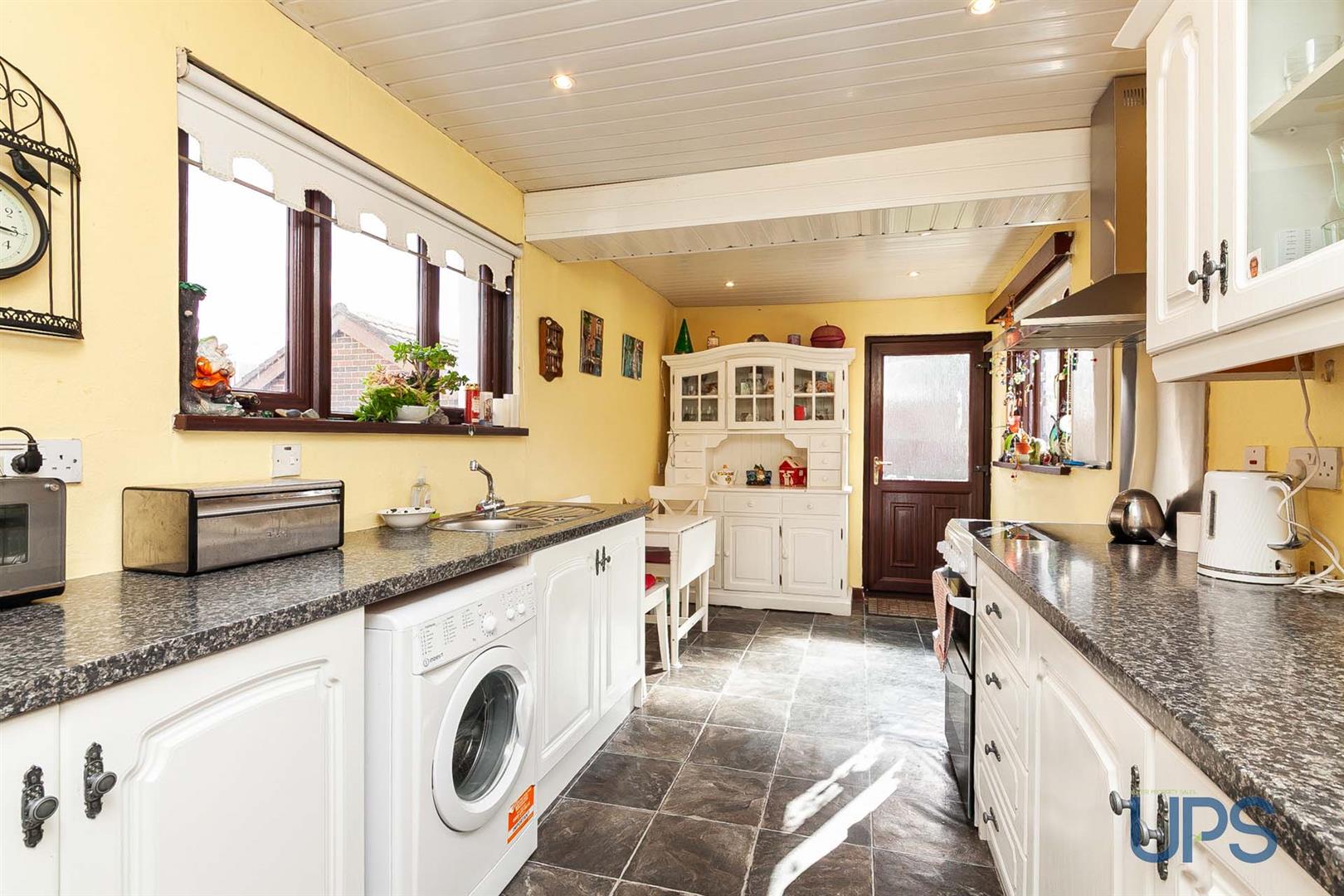 Range of high and low level units, formica work surfaces, single drainer stainless steel sink unit, overhead extractor hood, plumbed for washing machine, upvc double glazed back door.
