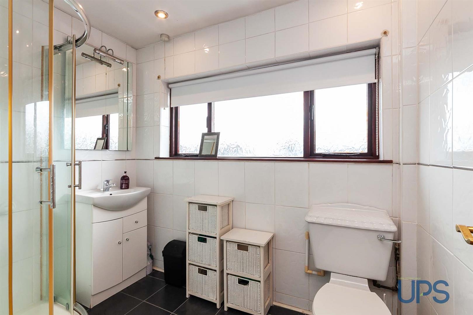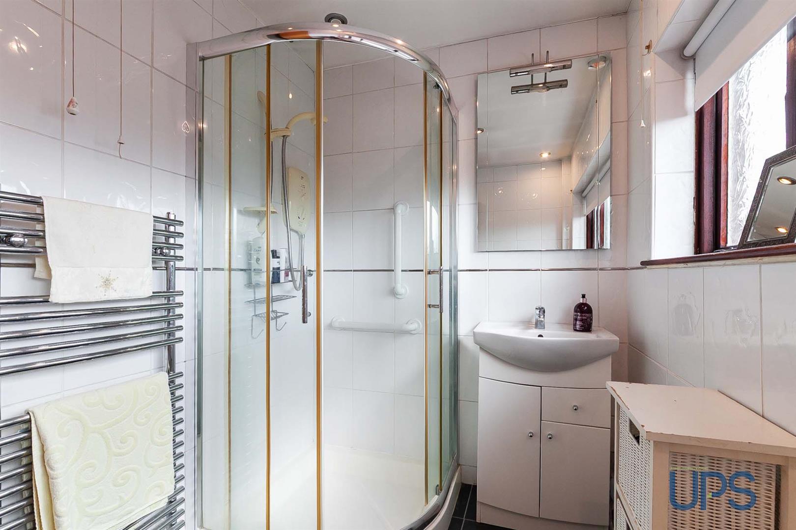 Shower cubicle, electric shower unit, tiling, wash hand basin with vanity unit, chrome heated towel rail.
