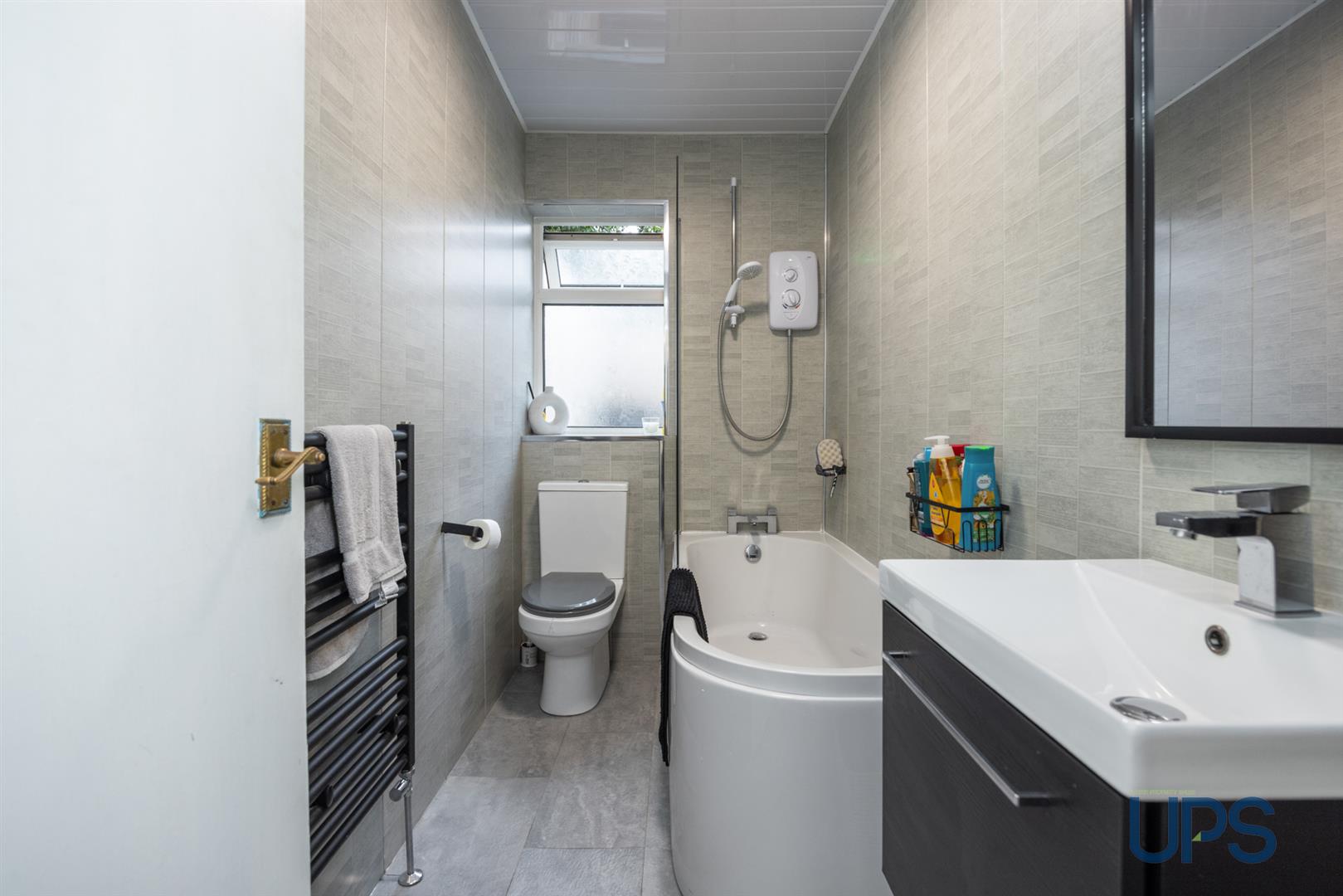 Feature panelled bath, electric shower unit, shower screen, pvc wall coverings, flooring, wash hand basin with vanity unit, chrome heated towel rail.
