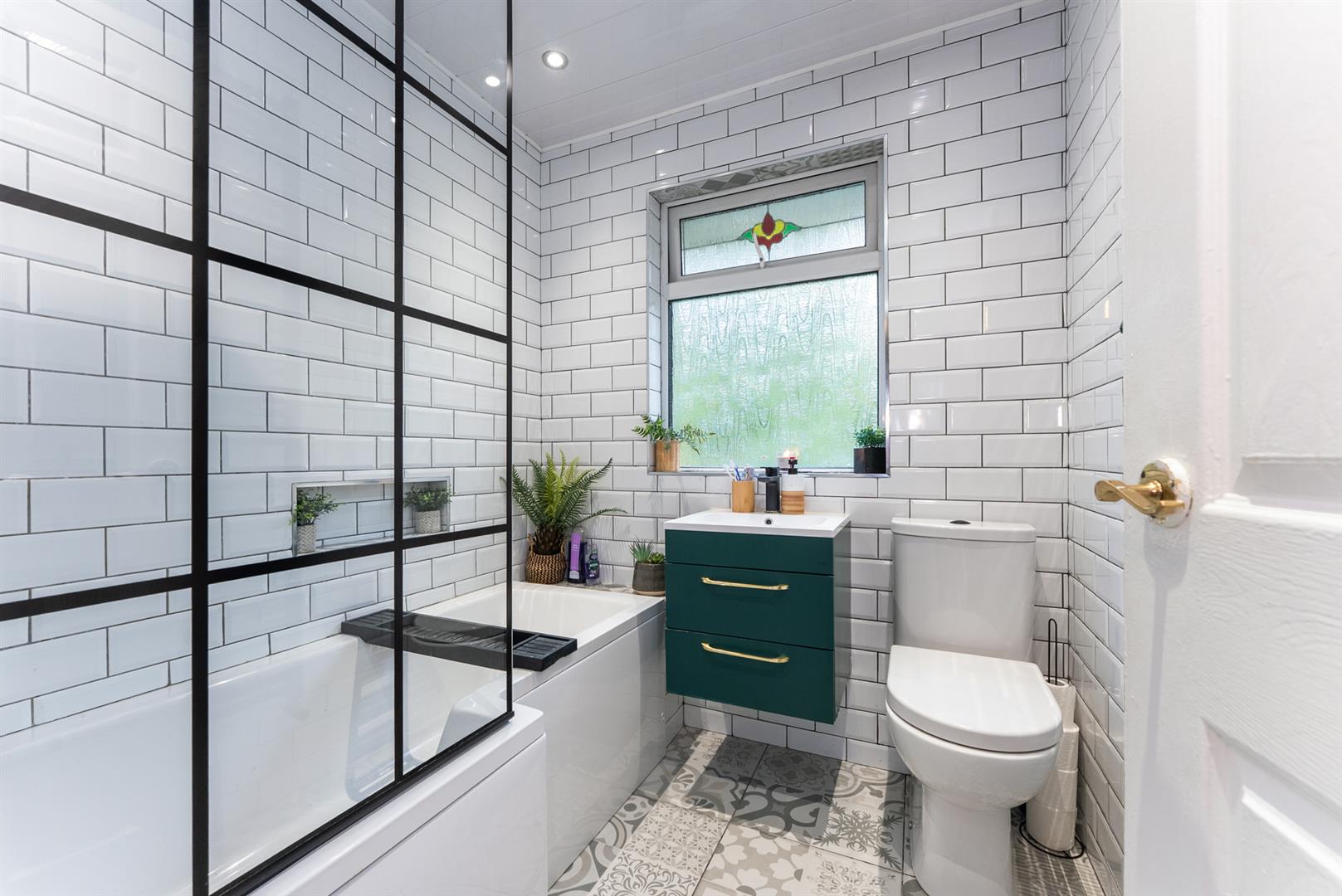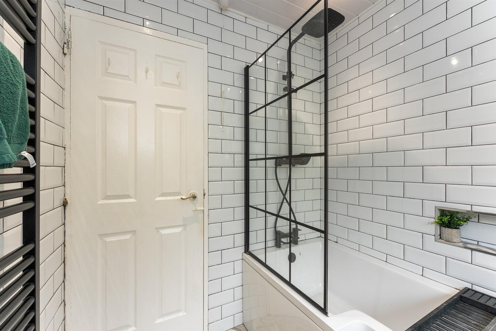 Panelled bath, feature shower screen, thermostatically controlled shower unit, tiling, ceramic tiled floor, wash hand basin with vanity unit, heated towel rail.
