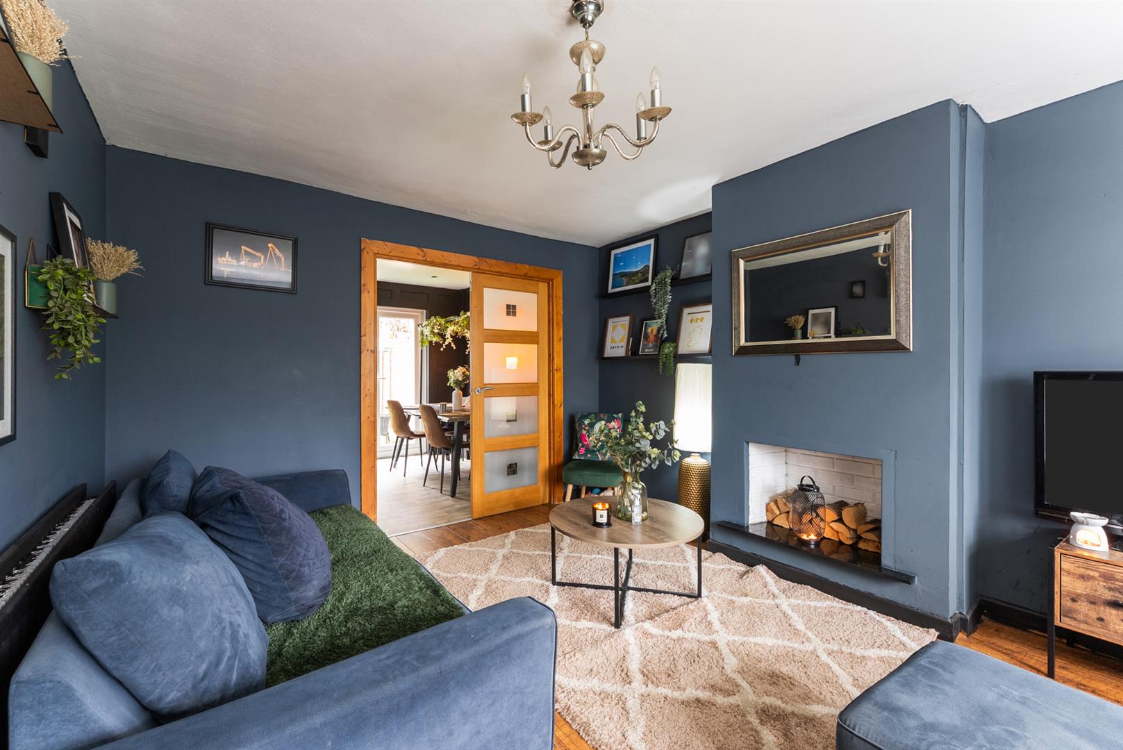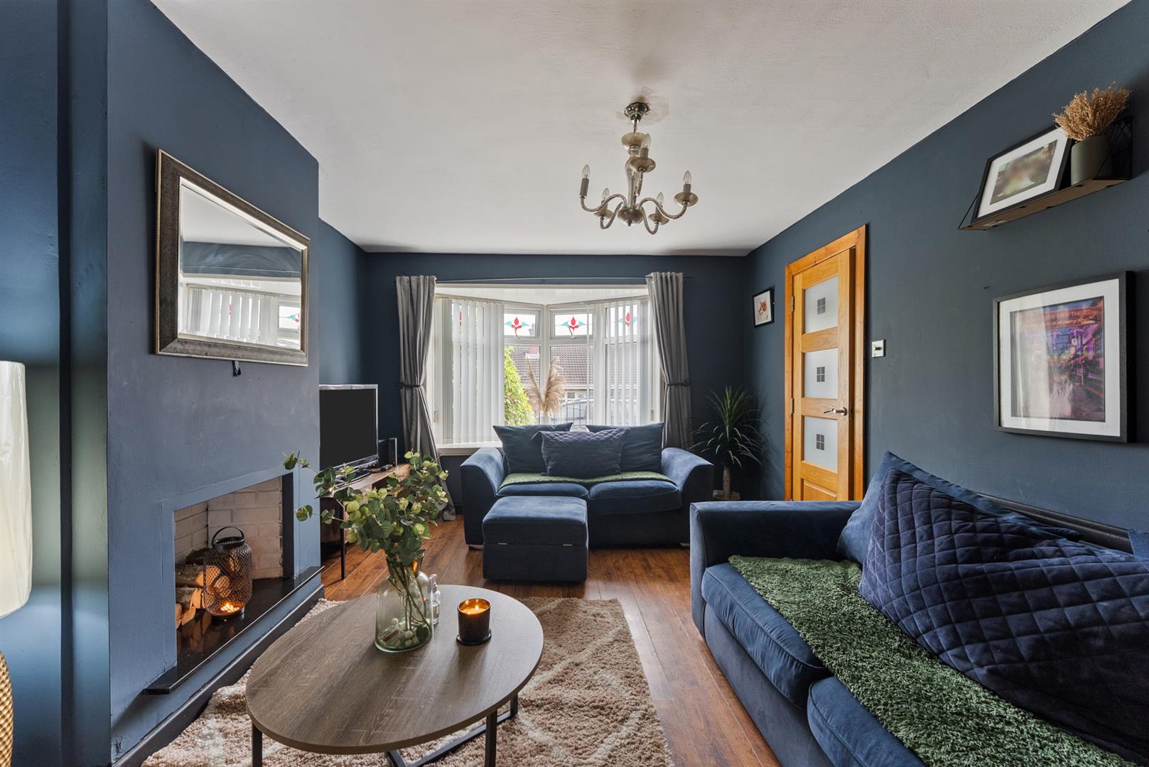 Feature fireplace, wooden effect strip floor, bay window, double doors to;