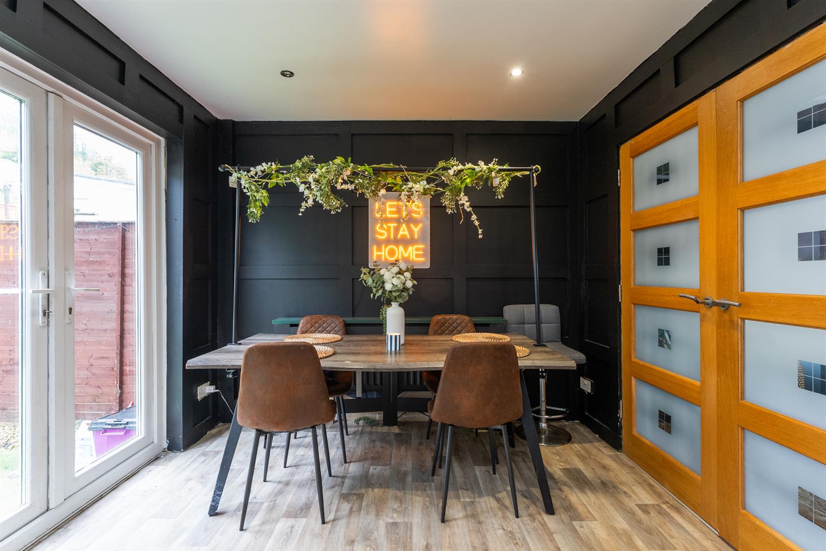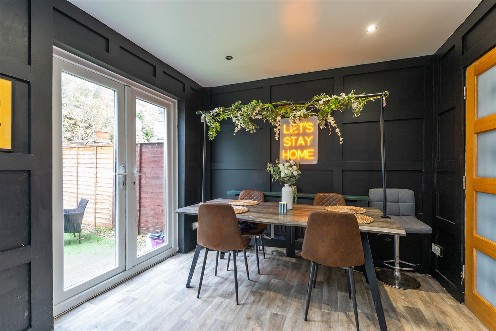 Contemporary high gloss fitted kitchen open to a casual dining area with feature double doors.