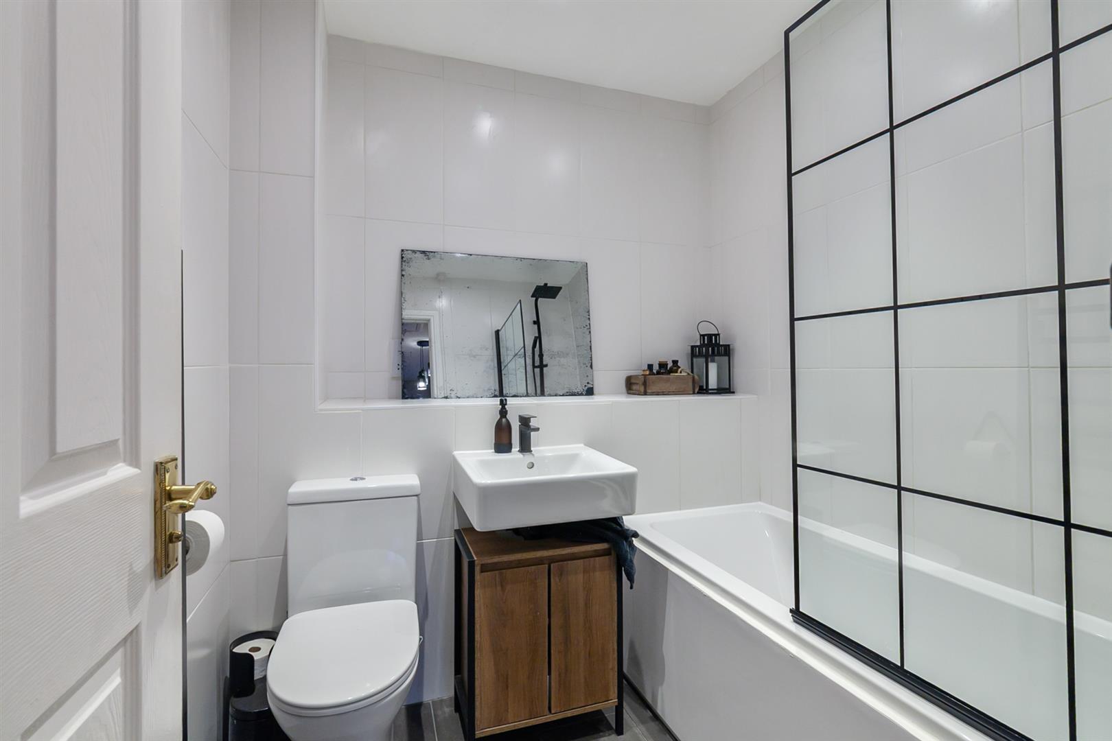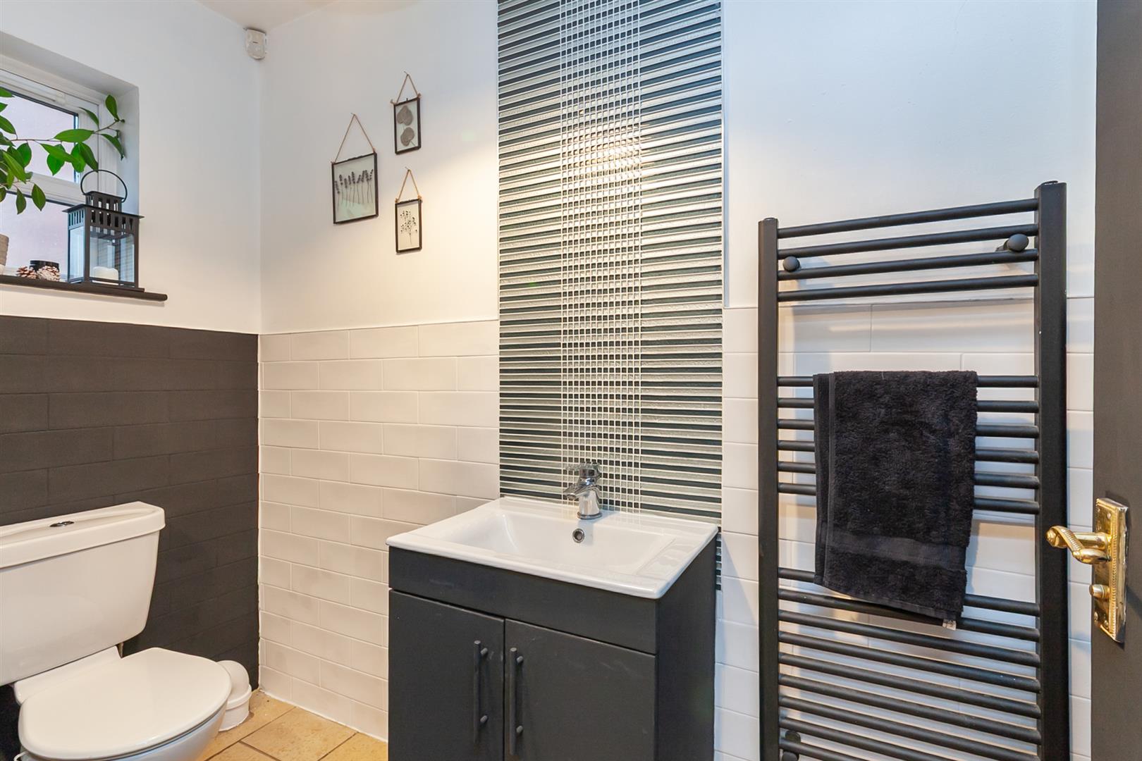 Low flush w.c, wash hand basin, vanity unit, tiling, heated towel rail, feature tiled flooring.