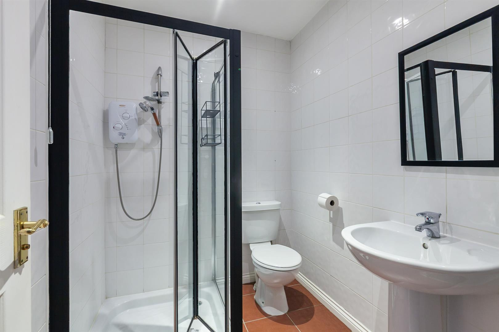 Fully tiled shower cubicle with electric shower unit, low flush w.c, pedestal wash hand basin, ceramic tiled floor, tiling.