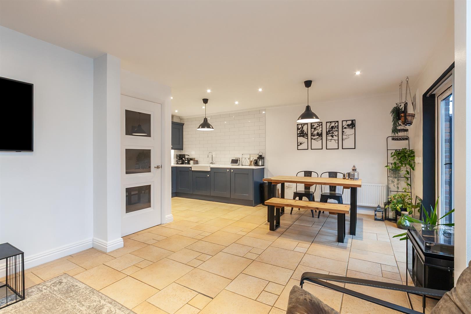 Open to full range of high and low level units, feature work tops, brick effect tiled walls, 4 ring gas hob, underoven, overhead extractor hood, Belfast sink unit, integrated fridge and freezer, feature tiled floor, Upvc double glazed patio doors, downlighters.
