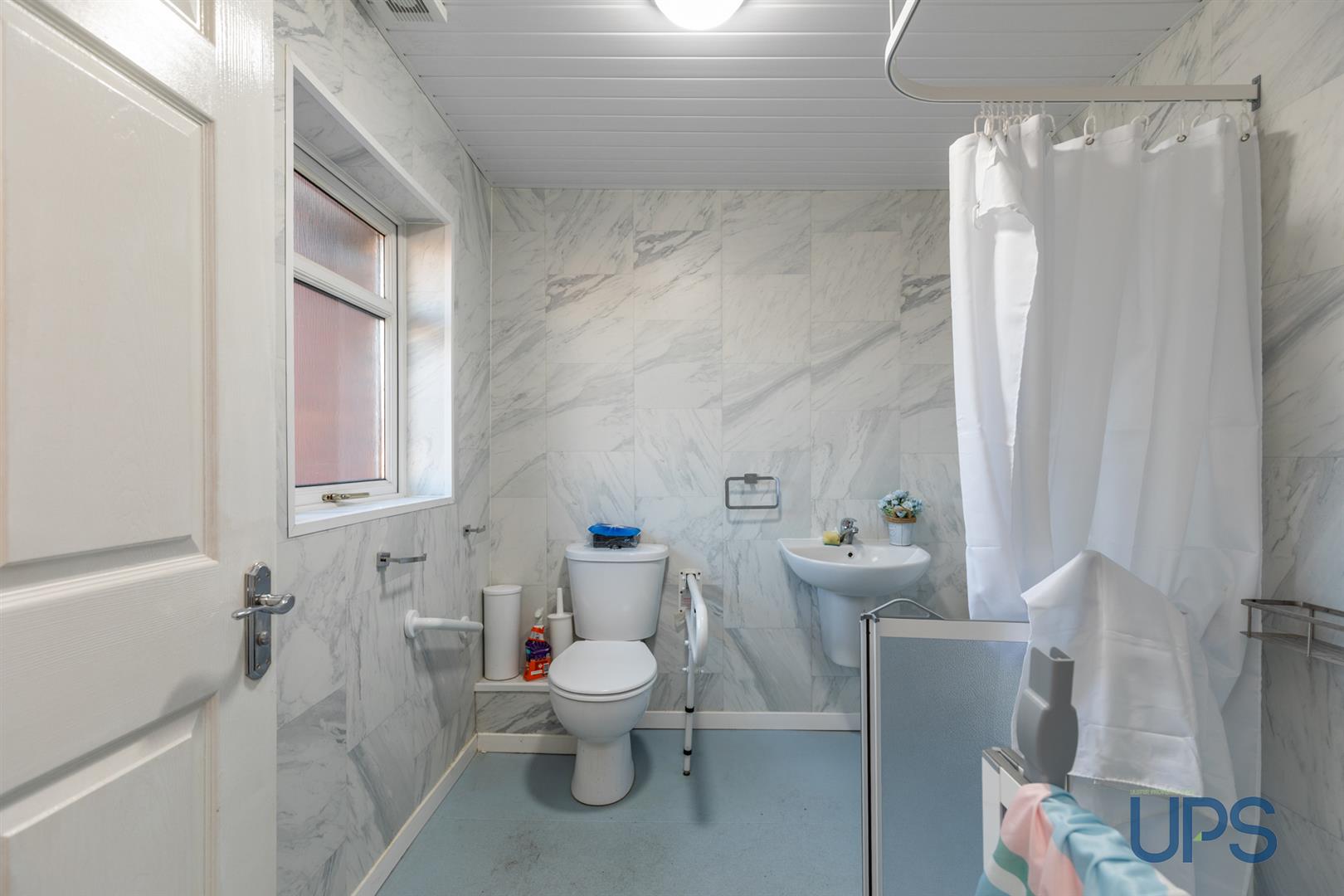 Thermostatically controlled shower unit, low flush w.c, 1/2 pedestal wash hand basin, chrome effect sanitary ware, pvc panelled walls and ceiling.