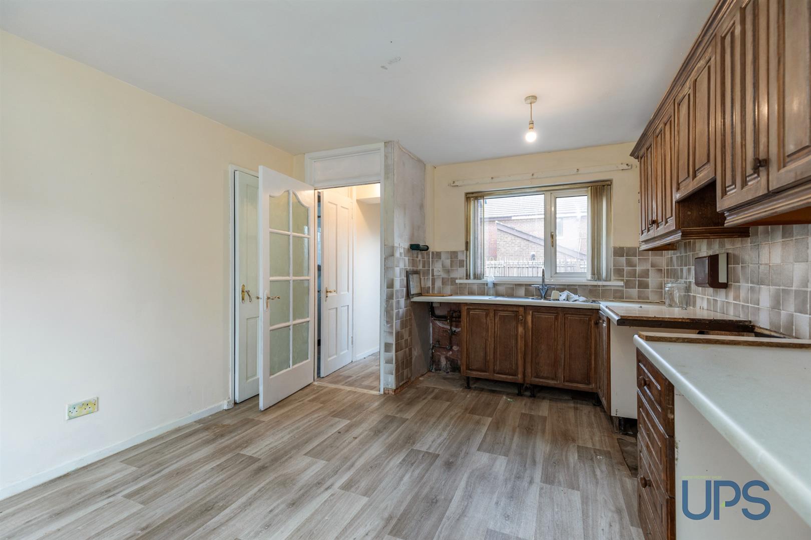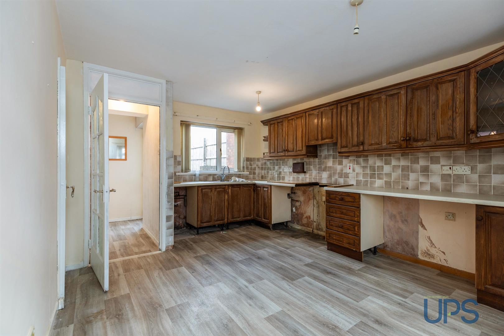 Range of high and low level units, single drainer stainless steel 1 1/2 bowl sink unit, storage cupboard, open plan to dining space.