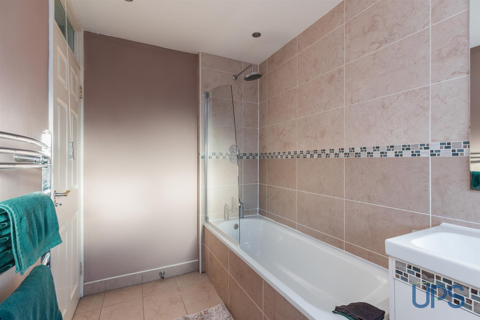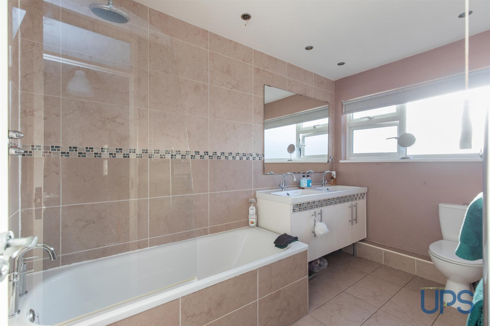 Bath, double sink unit, low flush w.c, thermostatically controlled shower unit, chrome heated towel rail.