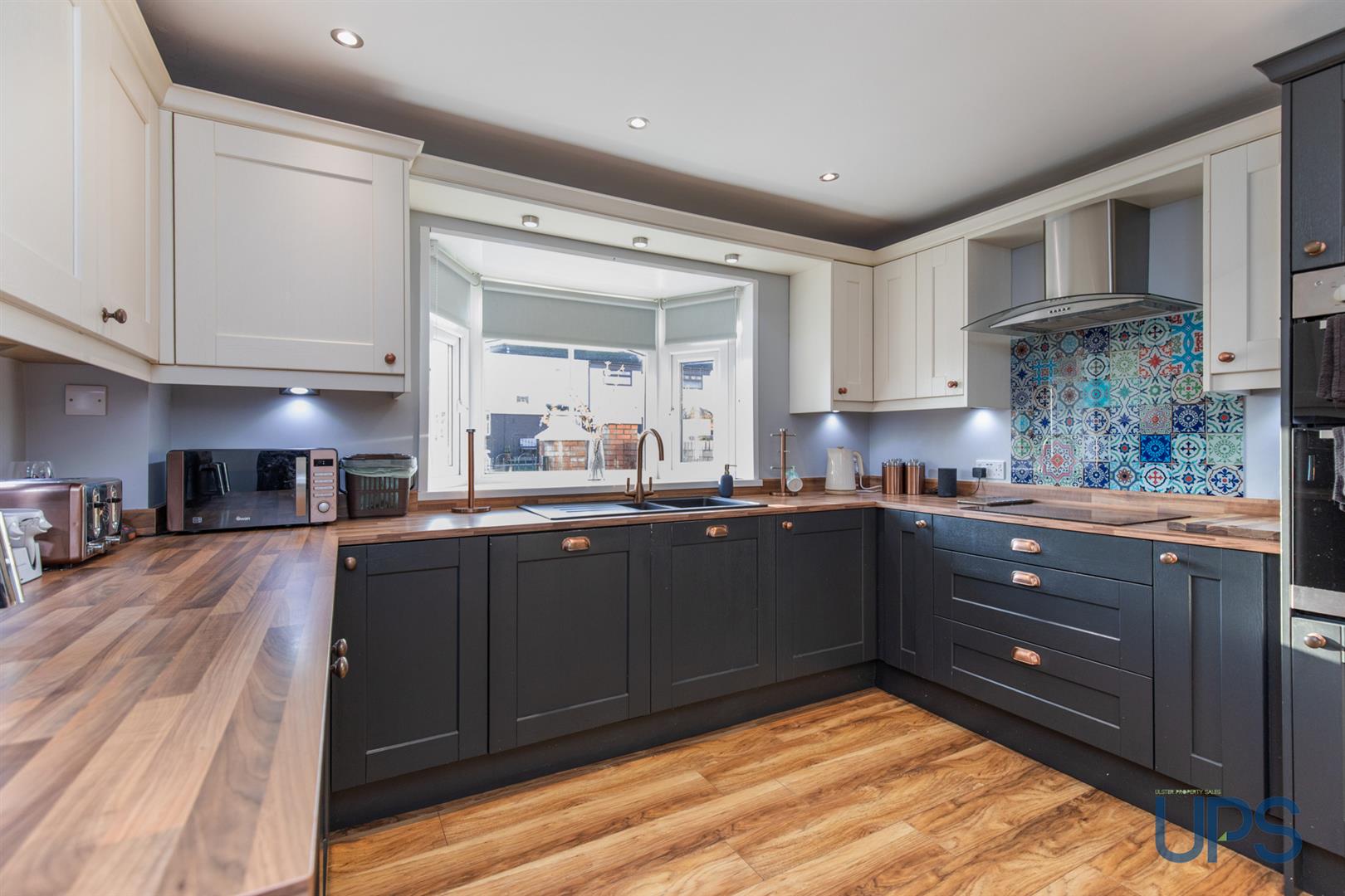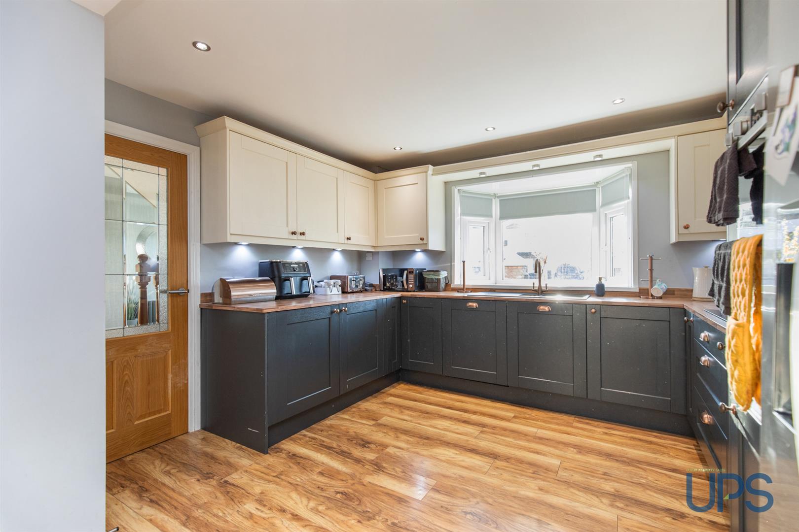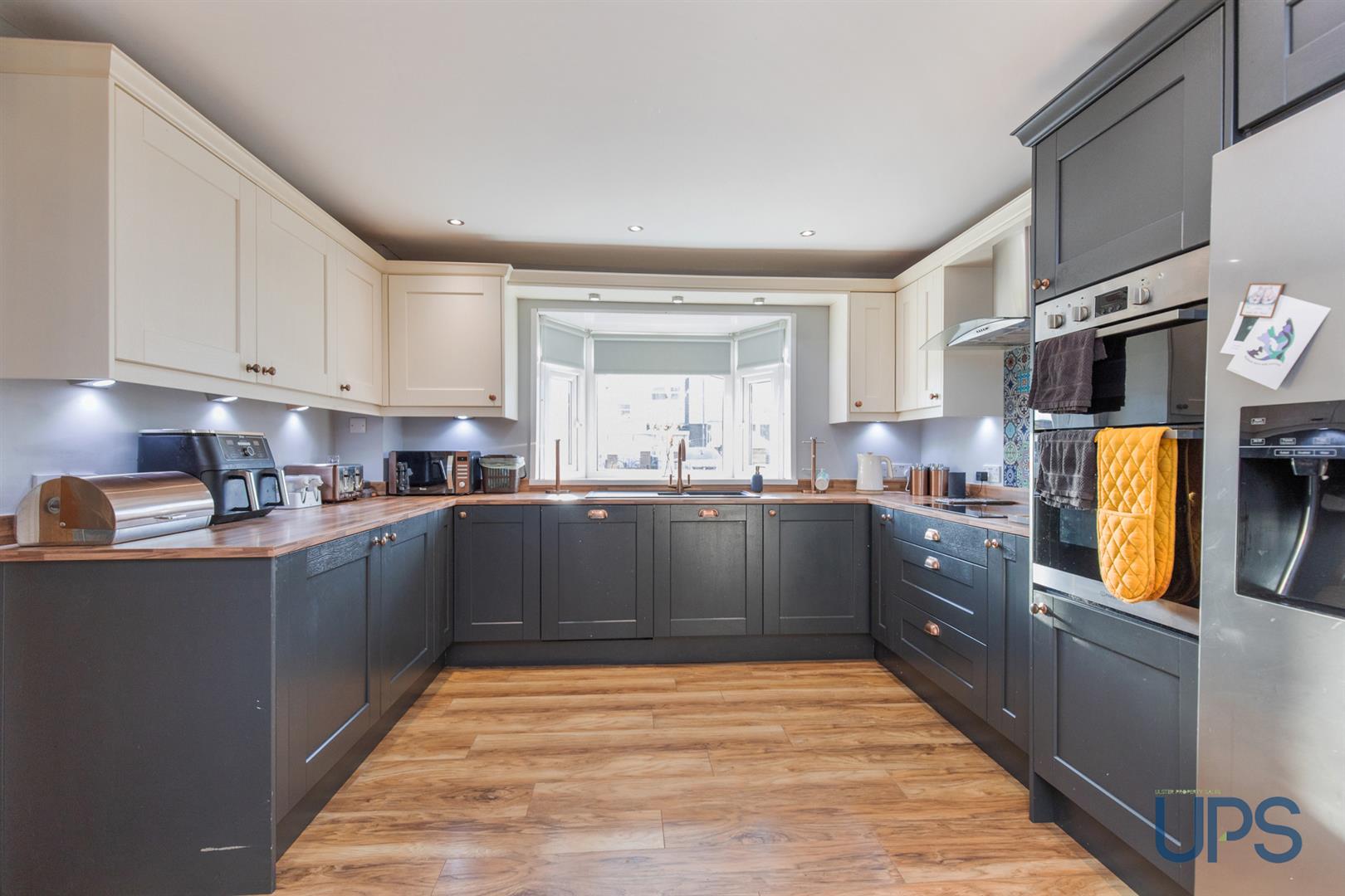 Range of high and low level units, formica work surfaces, single drainer stainless steel sink unit, dishwasher, 4 ring ceramic hob, overhead extractor hood, built-in oven, wooden effect strip floor, downlighters, bay window, double doors.