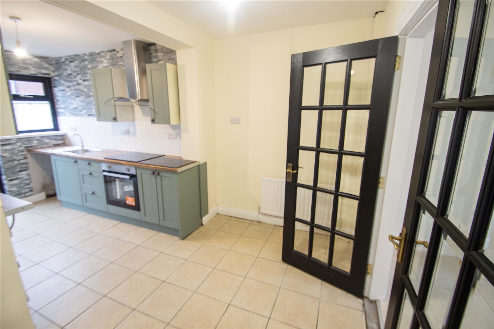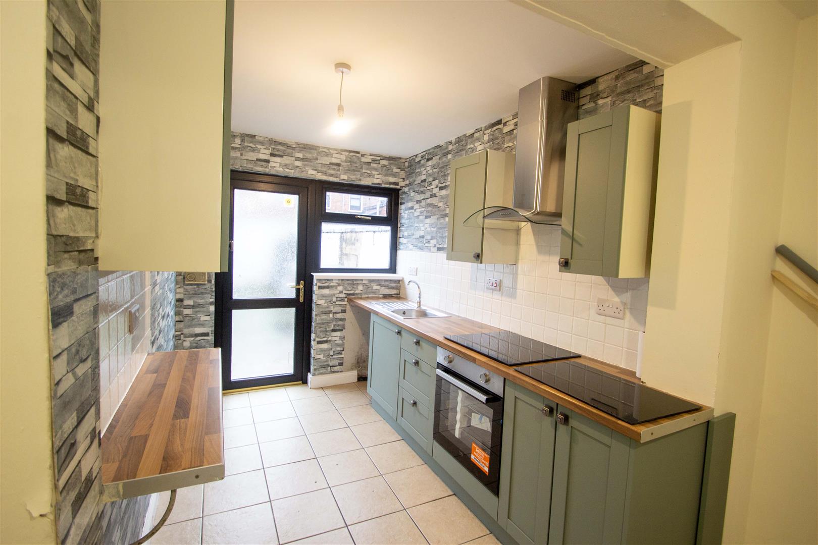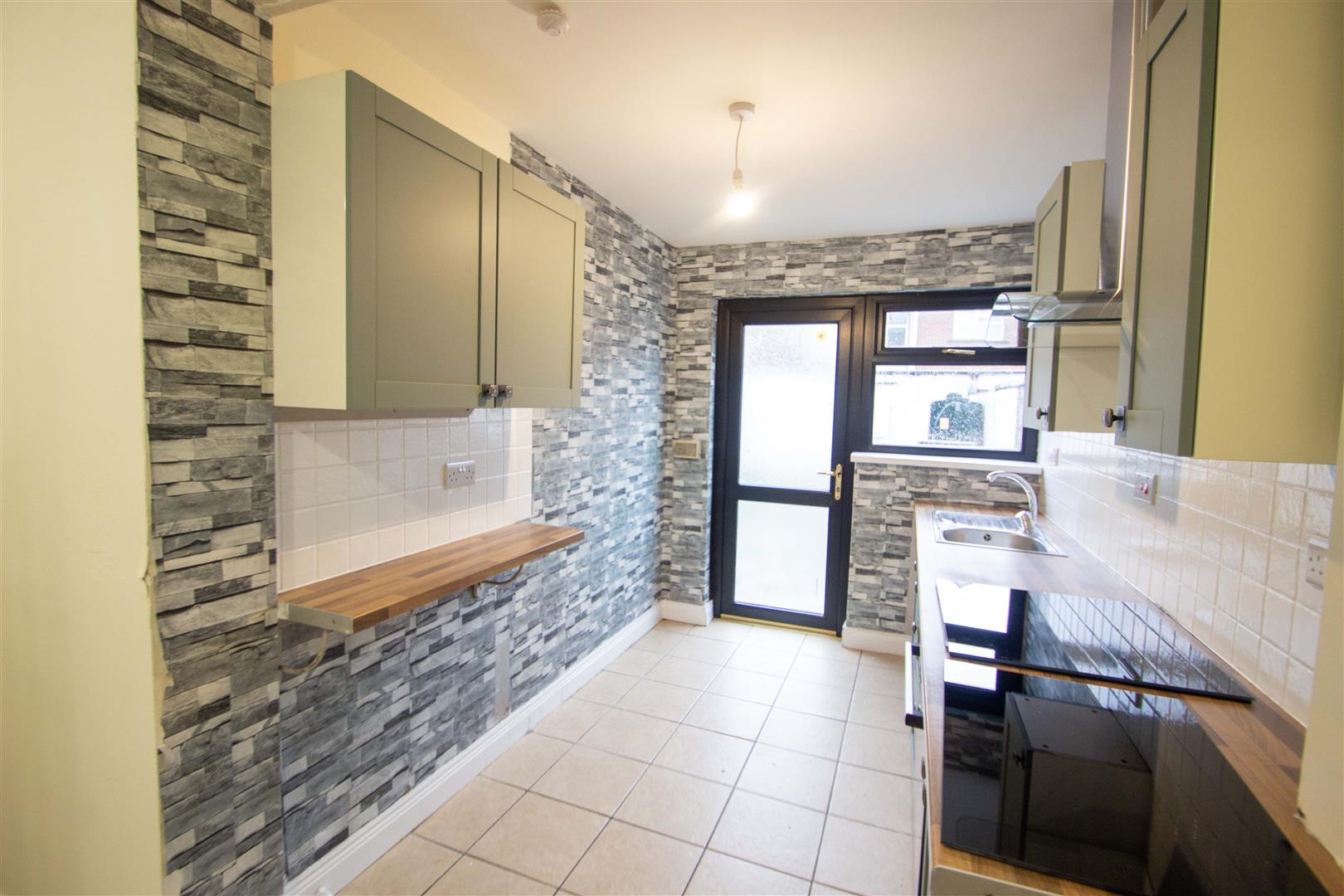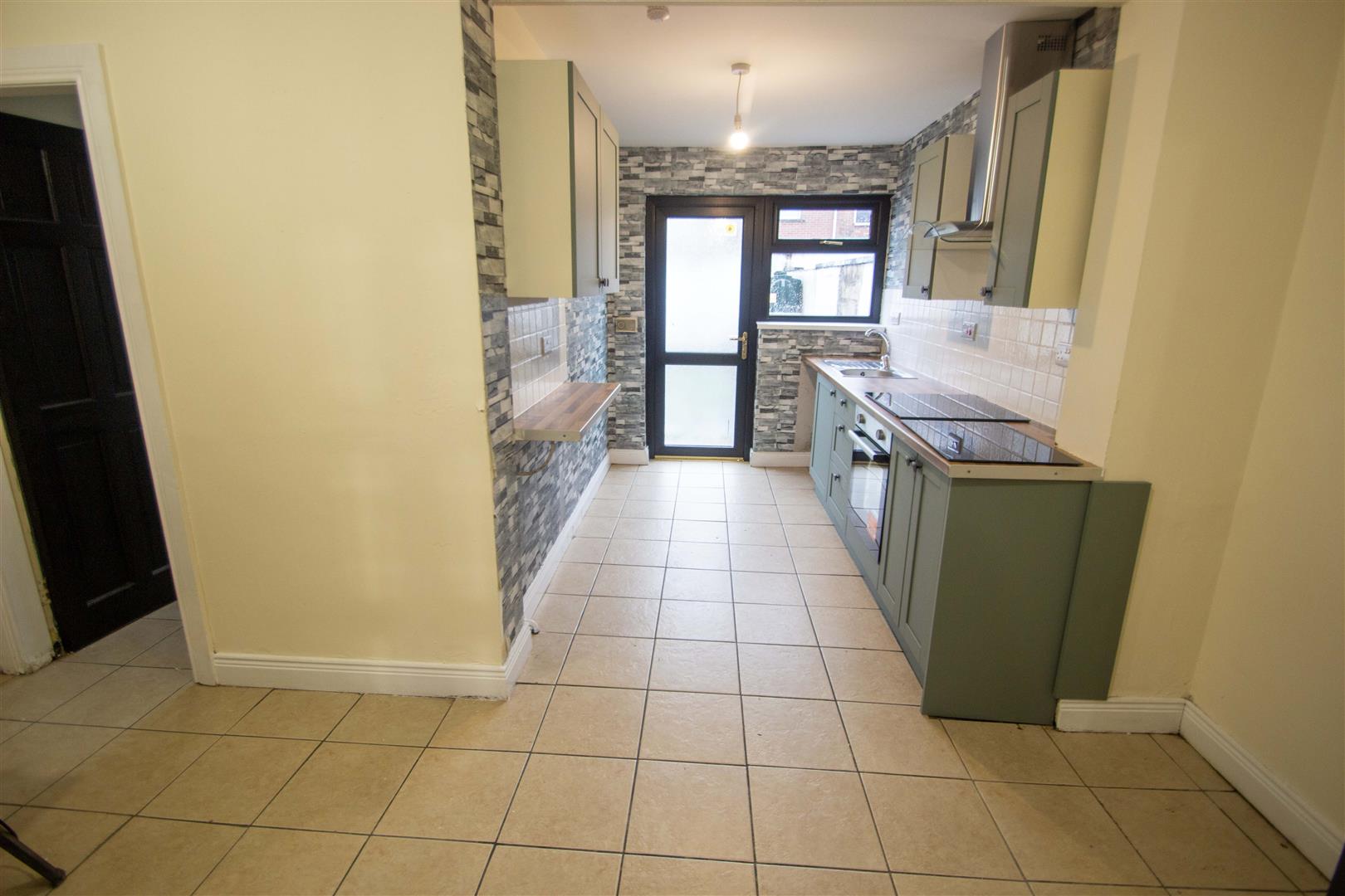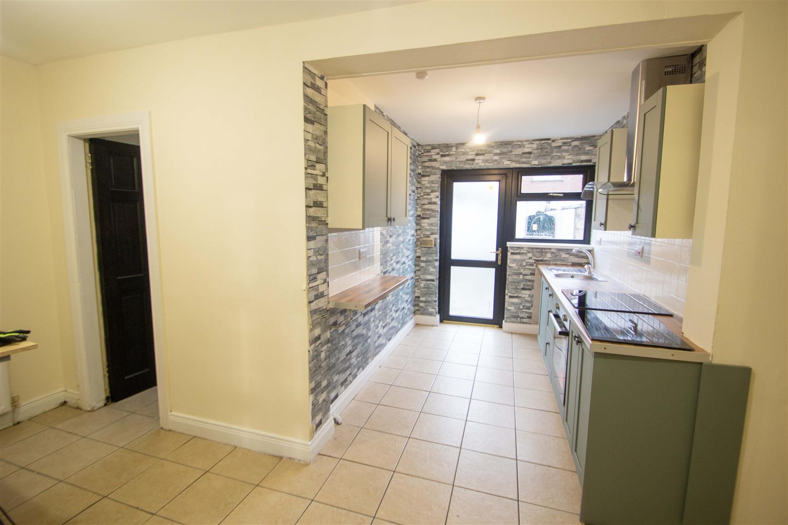 New range of high and low level units, formica work surfaces, 4 ring hob, underoven, overhead extractor hood, tiling, ceramic tiled floor, single drainer stainless steel sink unit, plumbed for washing machine, Upvc double glazed back door.