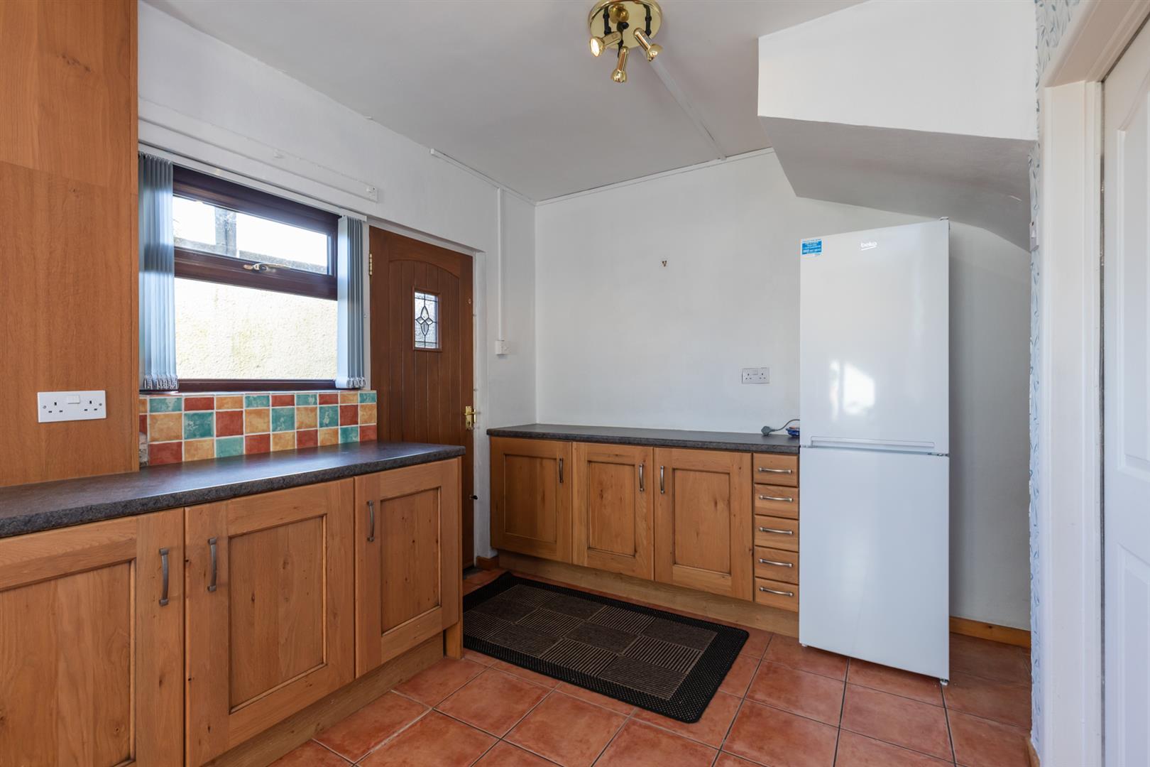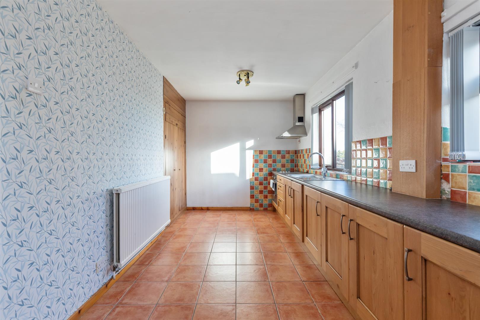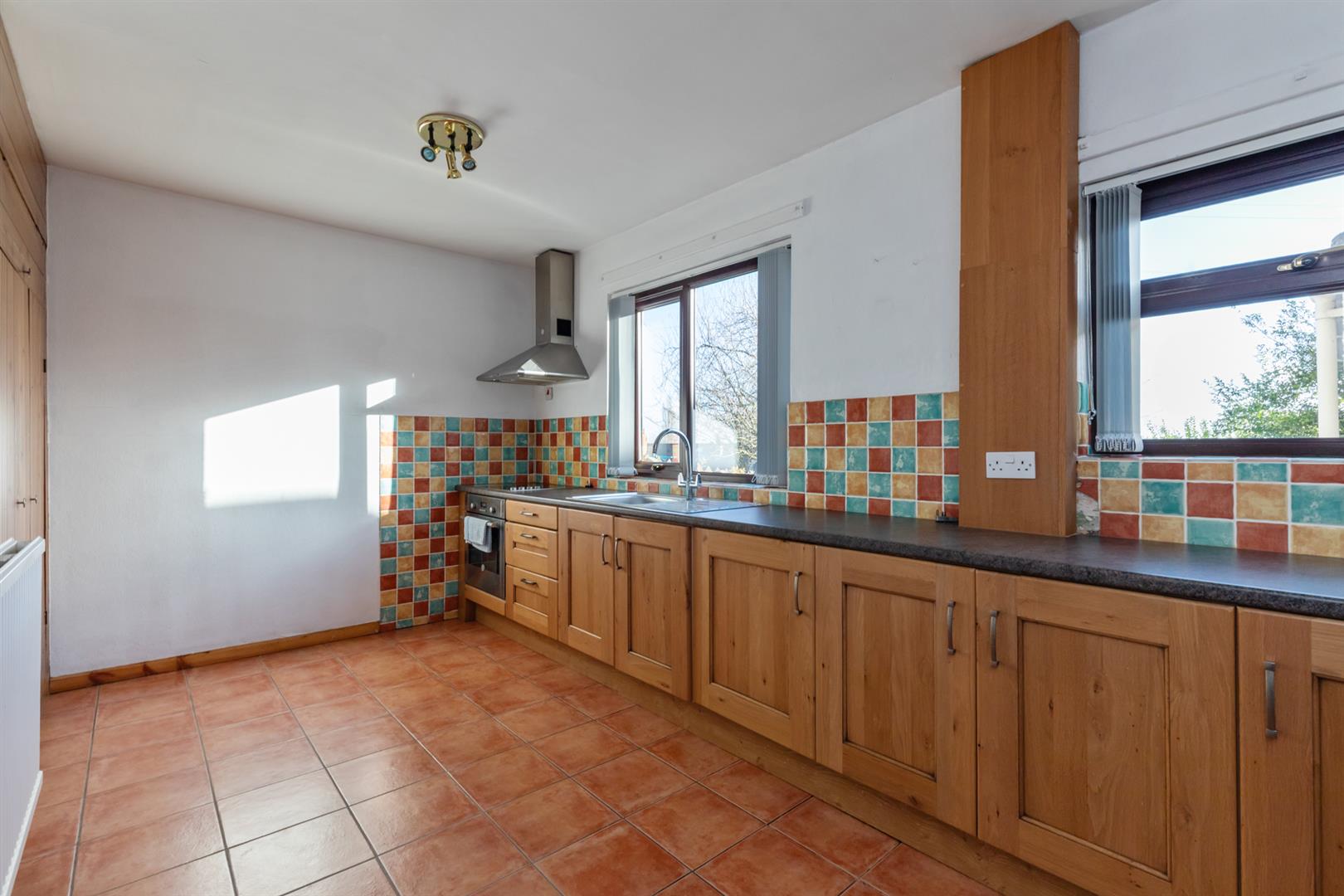 Range of low level units, formica work surfaces, tiling, sink unit, ceramic tiled floor, 4 ring ceramic hob, overhead extractor hood, plumbed for washing machine.