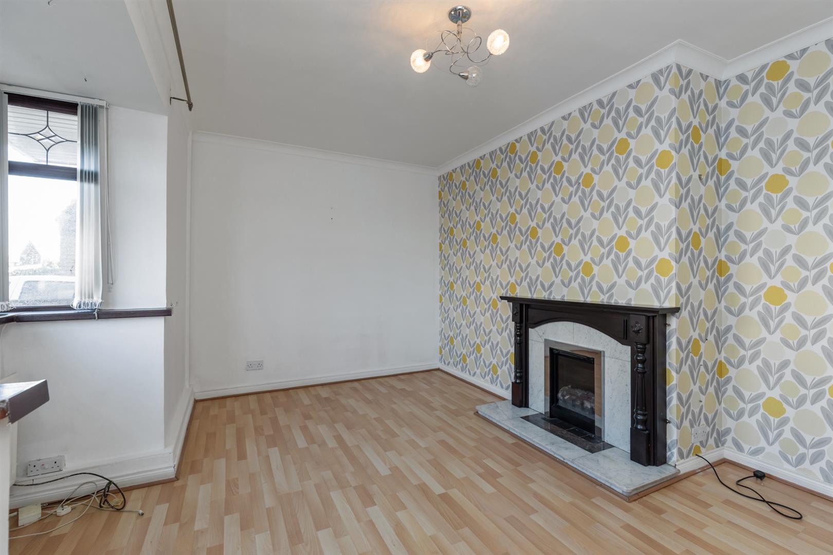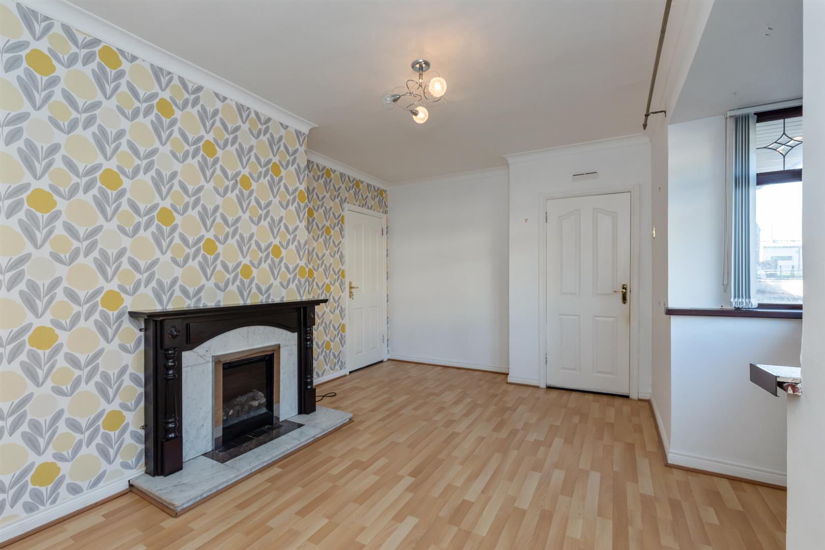 Feature fireplace with inset and hearth, wooden effect strip floor. bay window.
