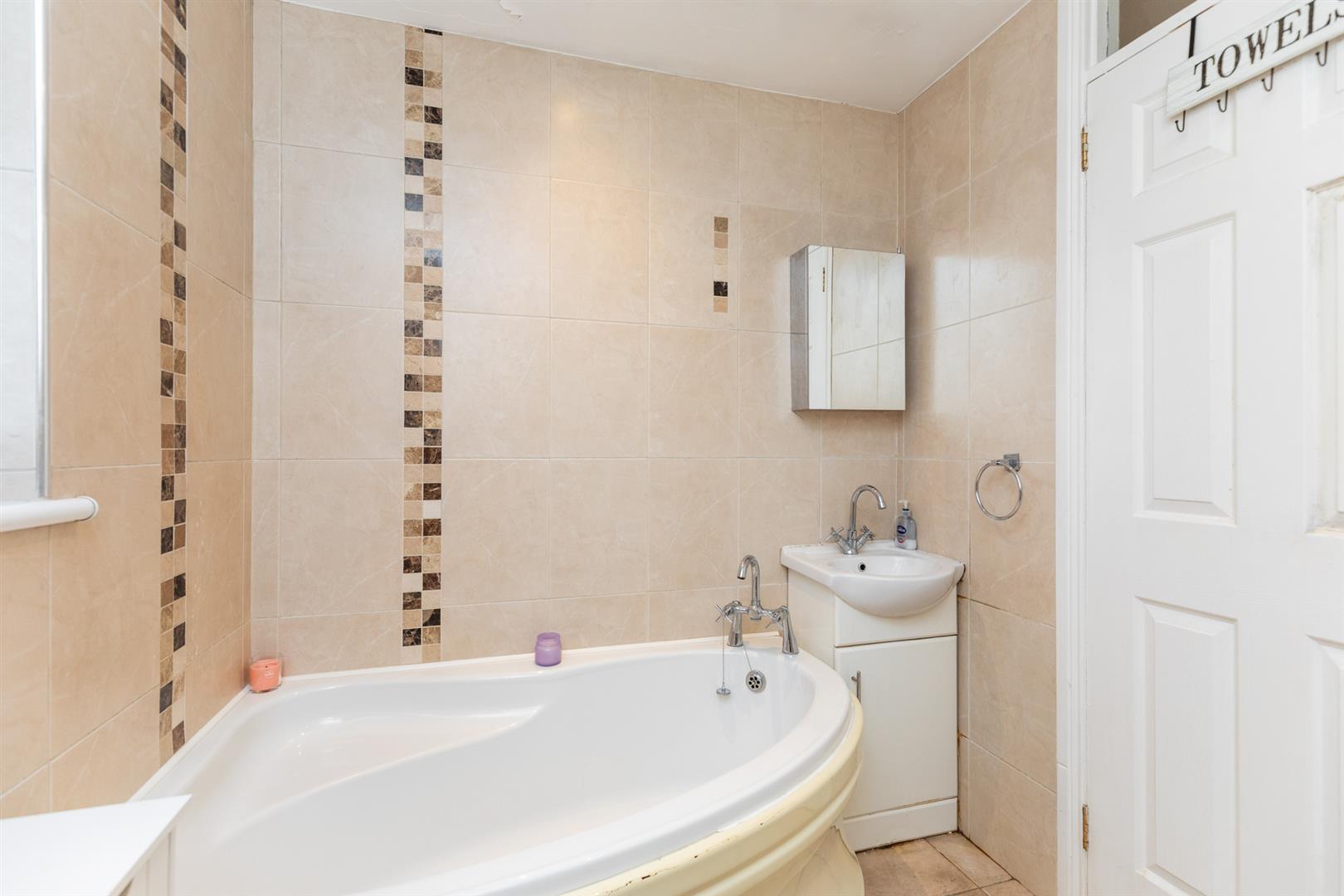 Bath, separate shower cubicle, shower unit, low flush w.c, wash hand basin, chrome effect towel warmer, chrome effect sanitary ware, spotlights, tiled walls and floor.