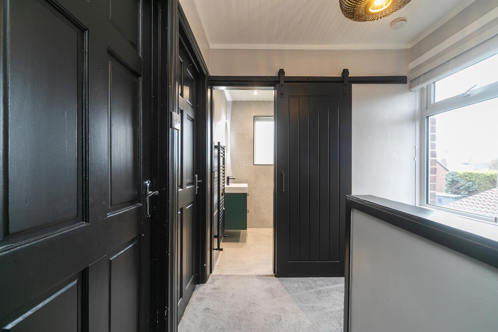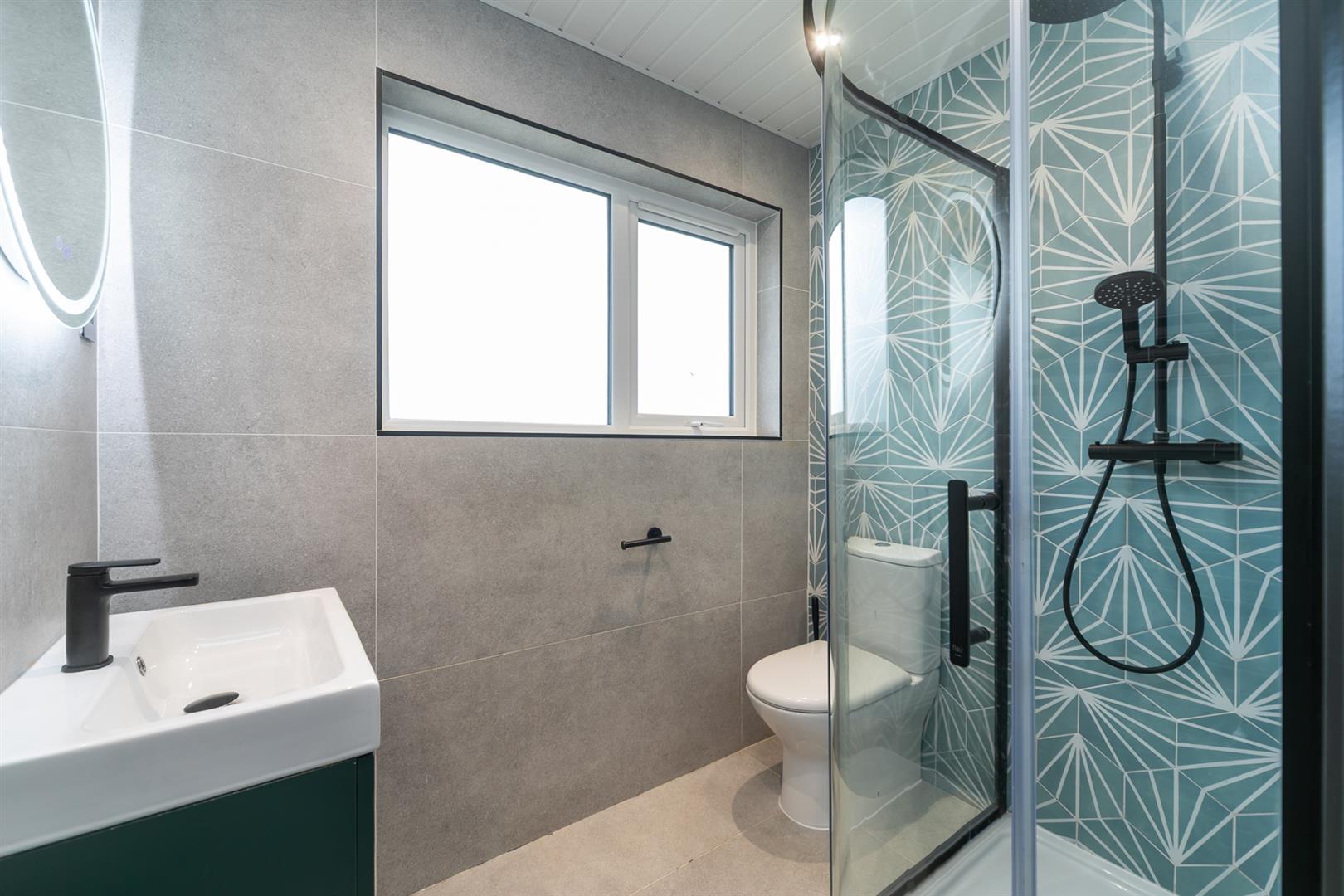 Modern first-floor shower room featuring contemporary tiling and spotlights.
