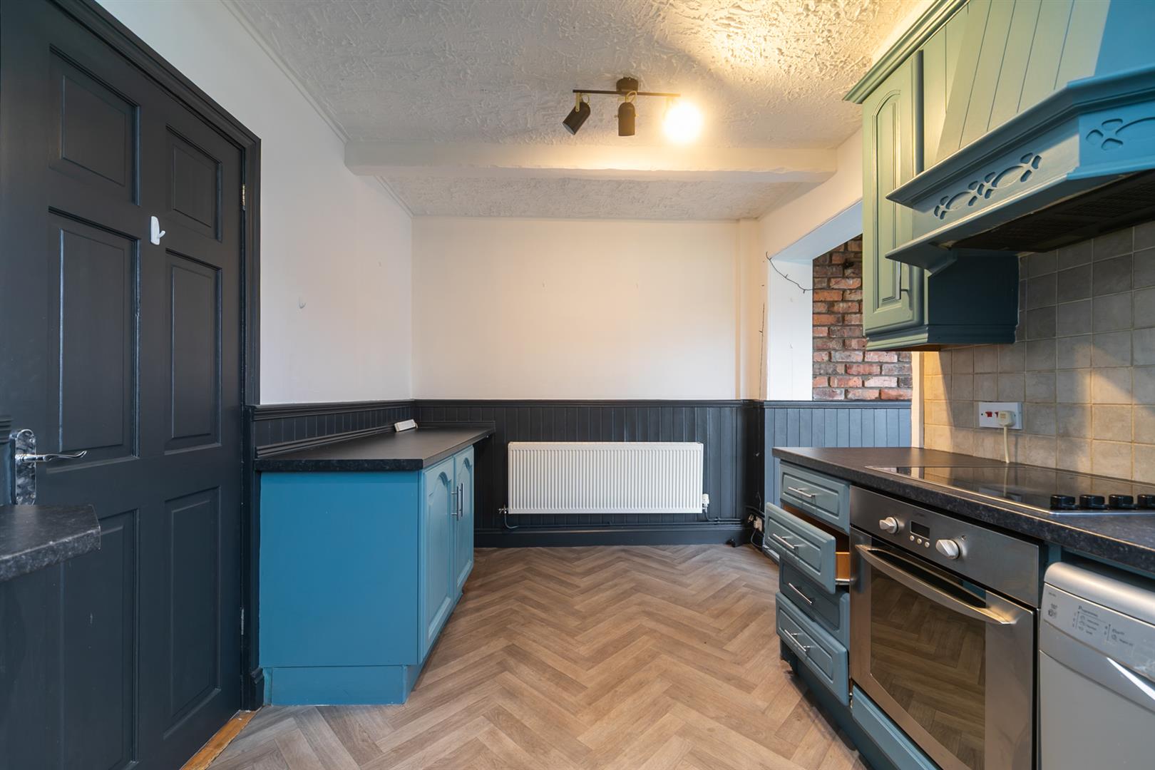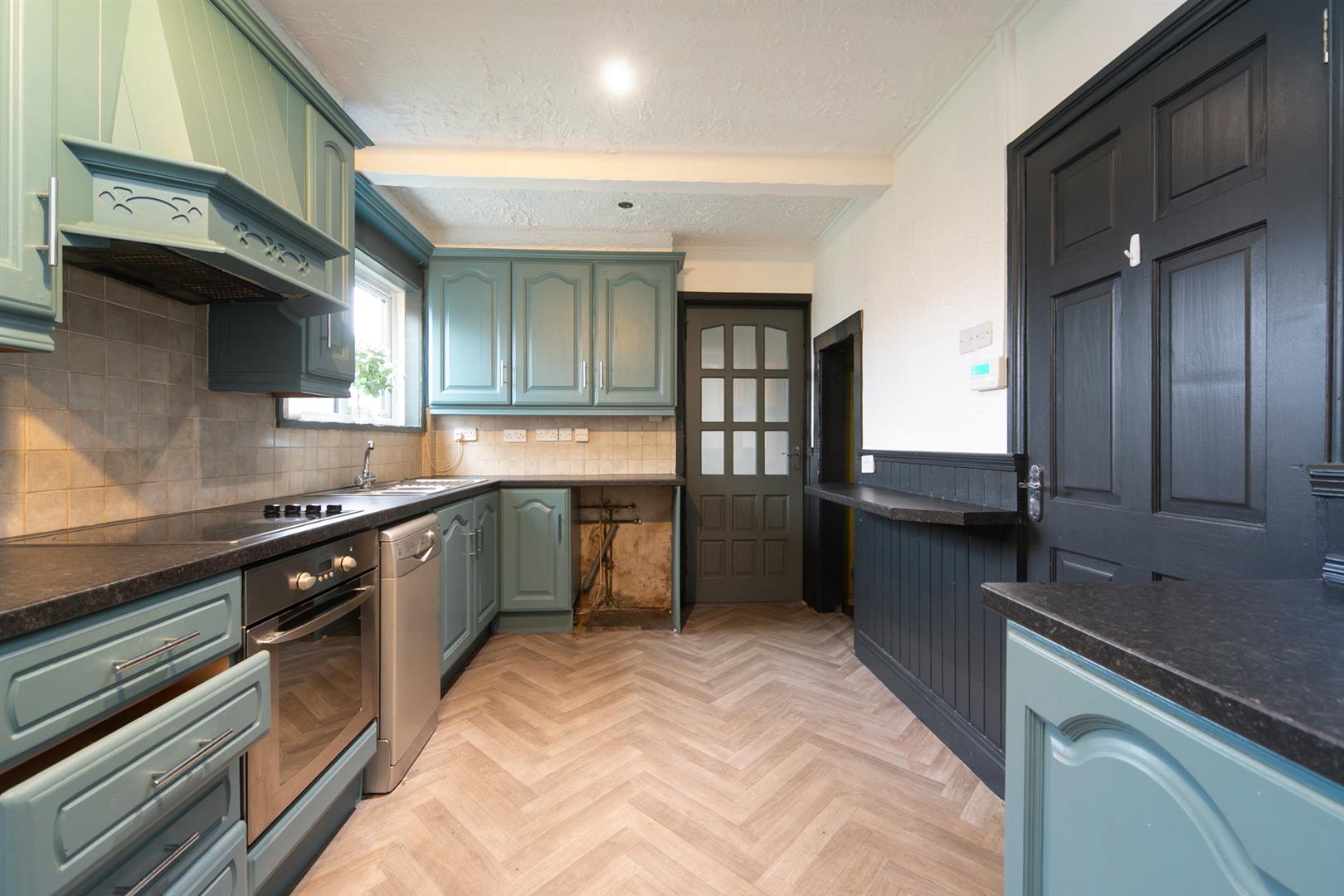 Range of high and low level units, single drainer stainless steel 1 1/2 bowl sink unit, plumbed for washing machine, built-in hob and underoven, extractor canopy, breakfast bar, spotlights, storage understairs, partially tiled walls, double glazed sliding patio door to rear gardens, access to;