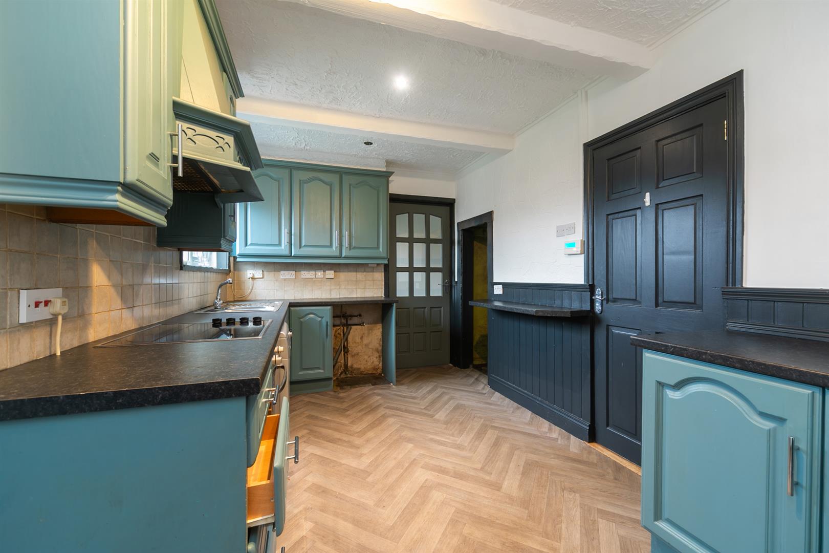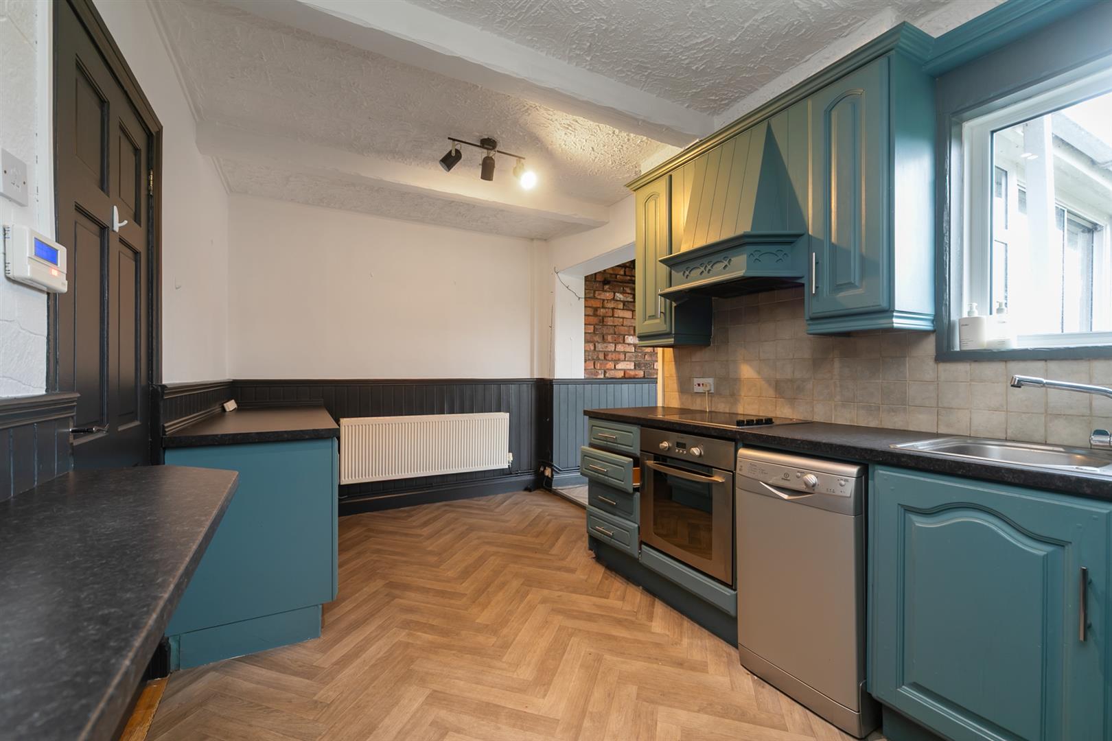 Kitchen with spotlights, open plan to a dining area that provides access to the conservatory.