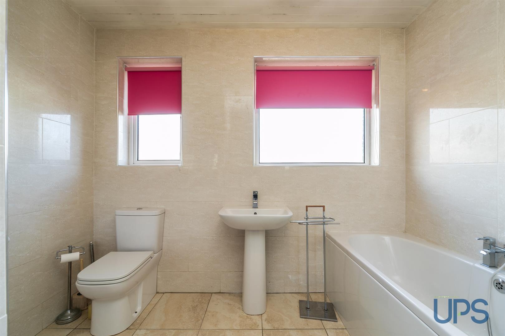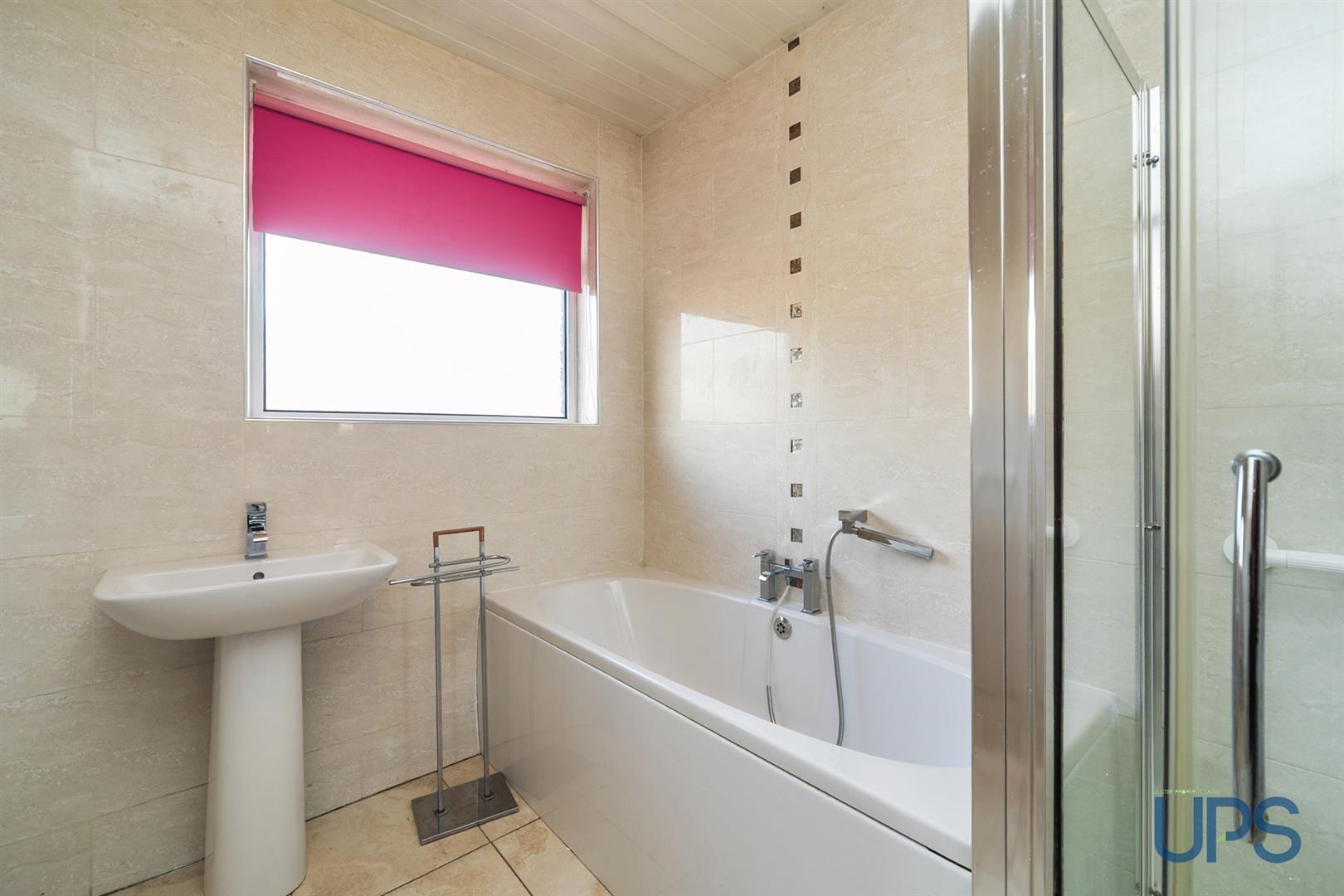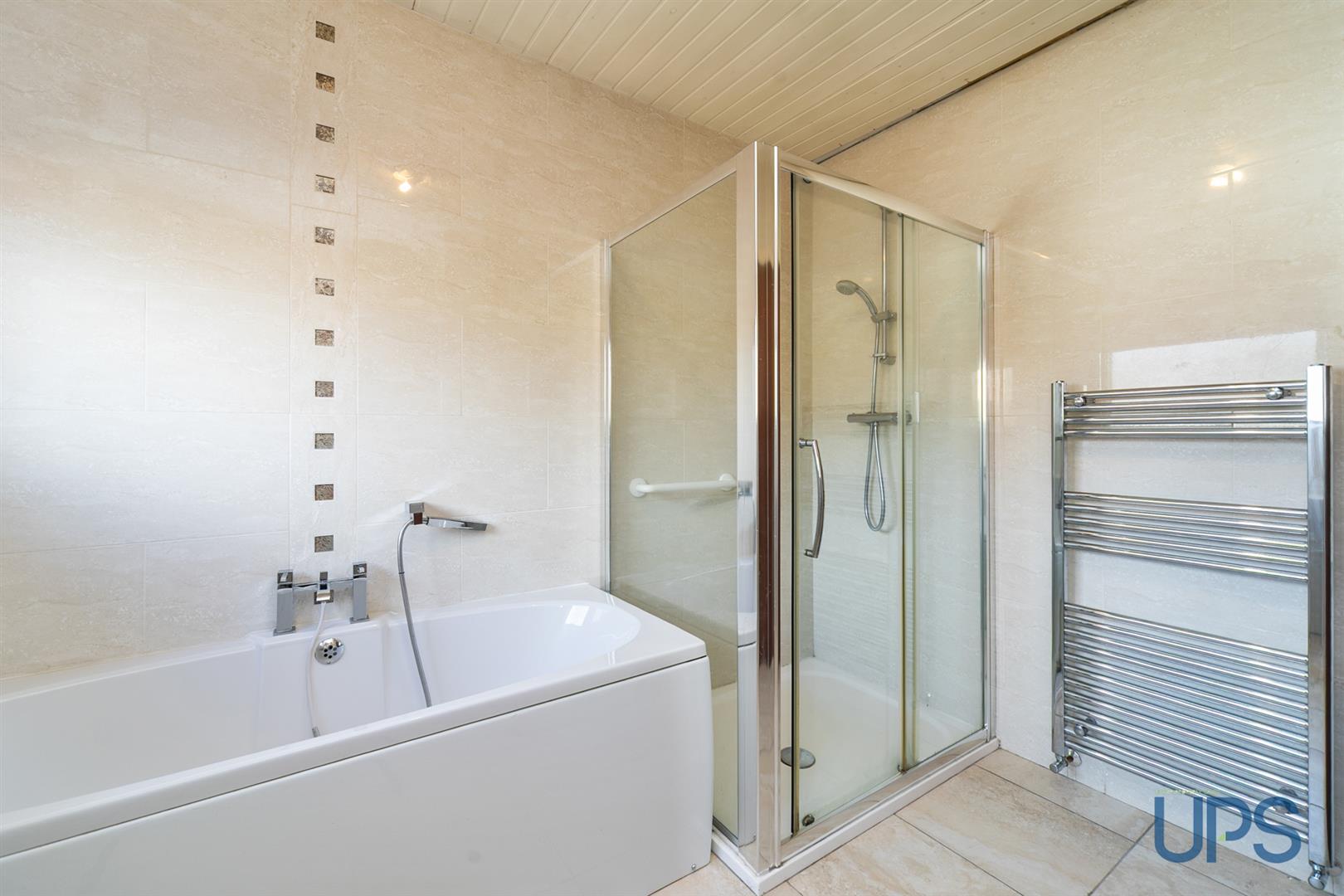 Bath, separate shower cubicle, low-flush W.C, pedestal wash hand basin, chrome effect sanitary ware, chrome effect towel warmer, beautiful tiled walls and floor.