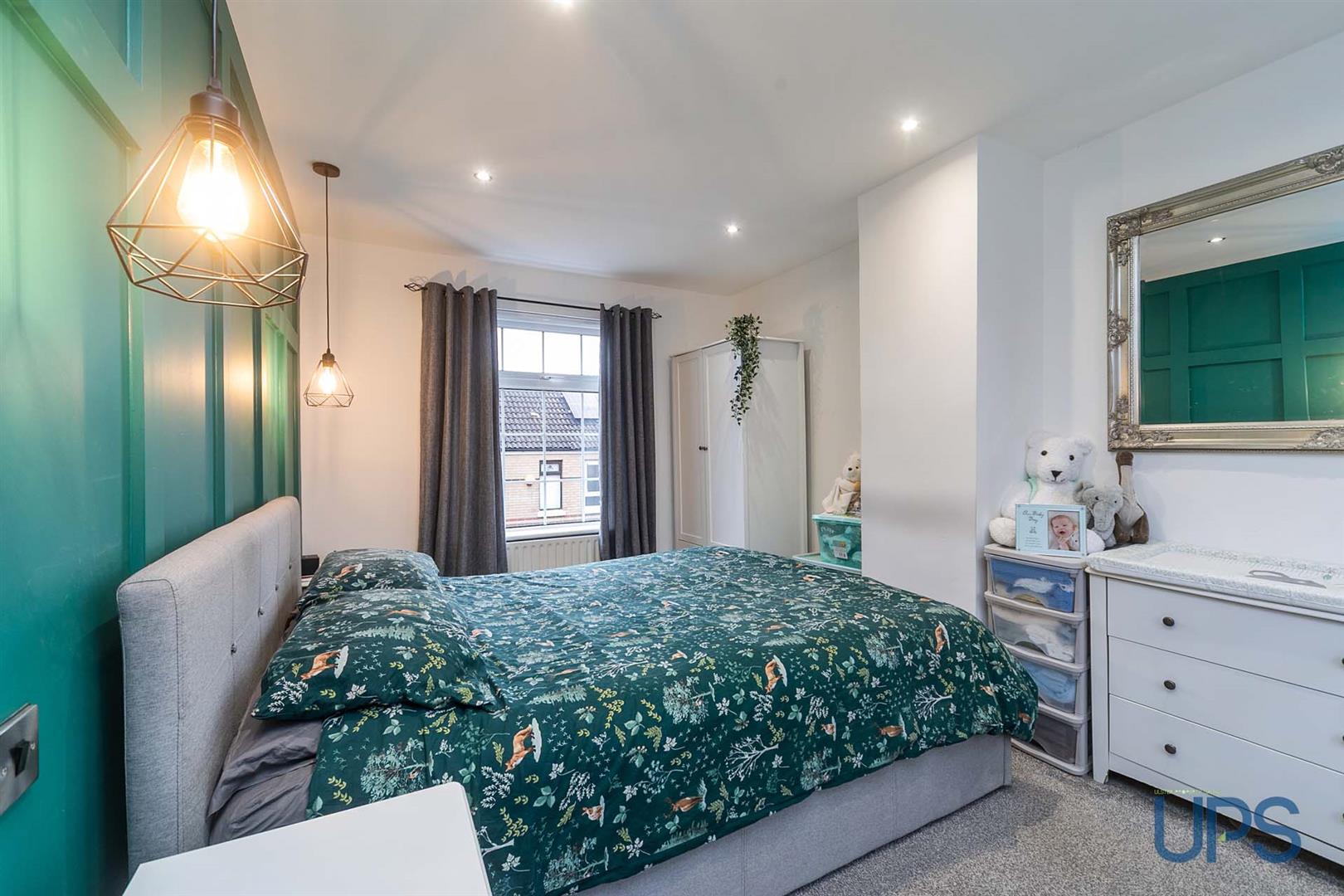 Principle bedroom with feature wall paneling.