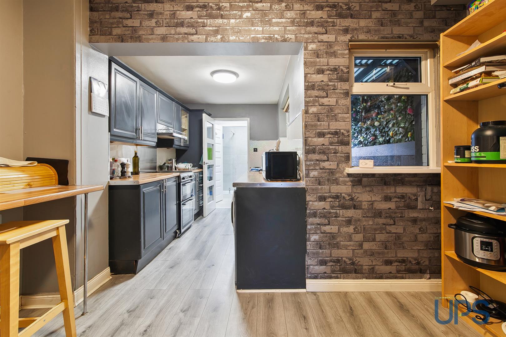 Range of high and low level unit, formica work surfaces, breakfast bar, wooden effect strip floor, single drainer stainless steel sink unit, overhead extractor hood, built-in cupboard, Worcester gas boiler.