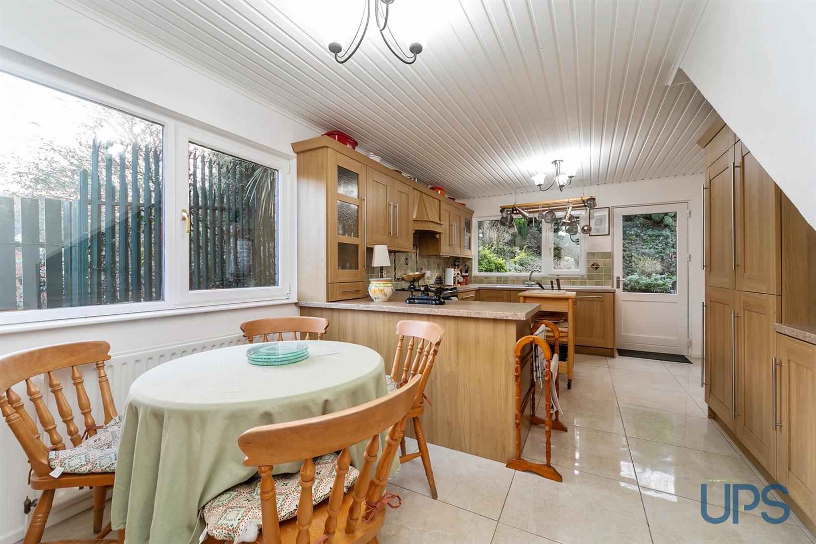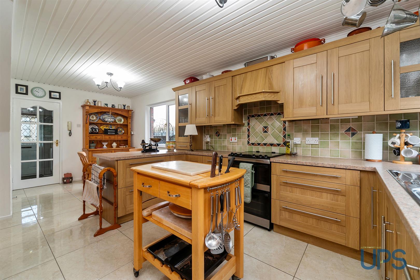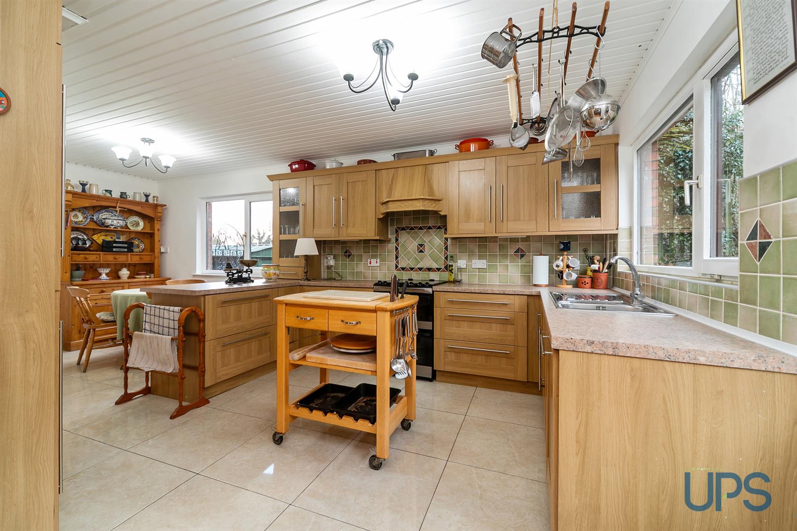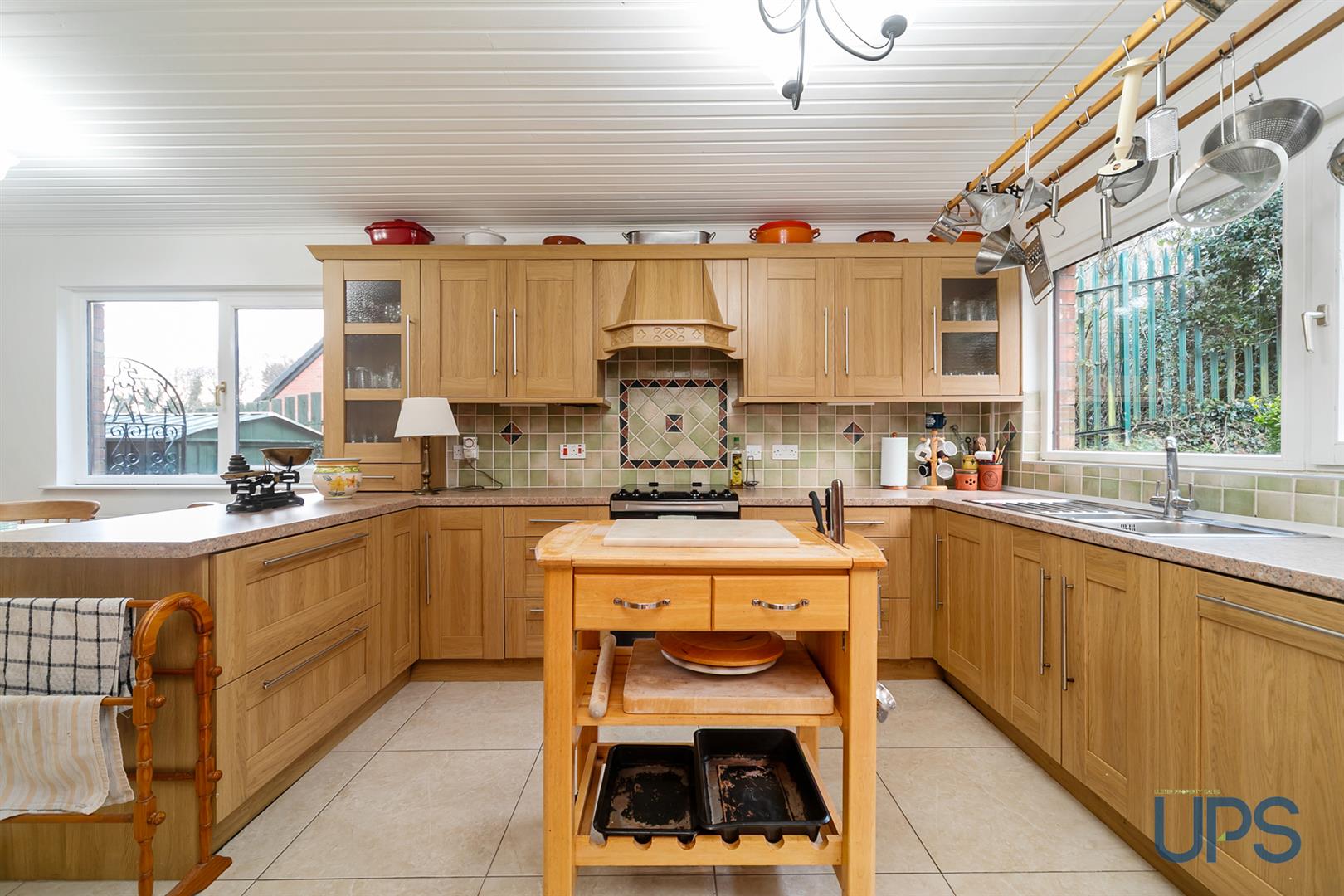 Range of high and low level units, single drainer stainless steel 1 1/2 bowl sink unit, breakfast bar, extractor canopy, integrated dishwasher, integrated fridge and freezer, tiled floor, open plan to dining space.