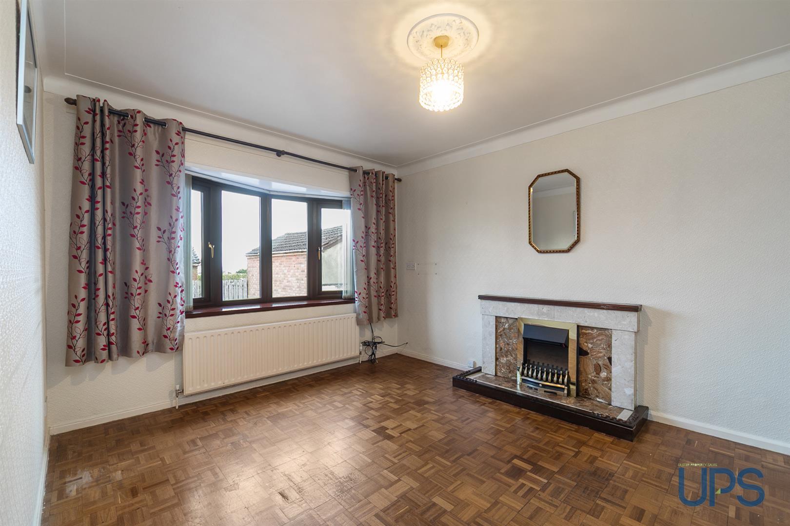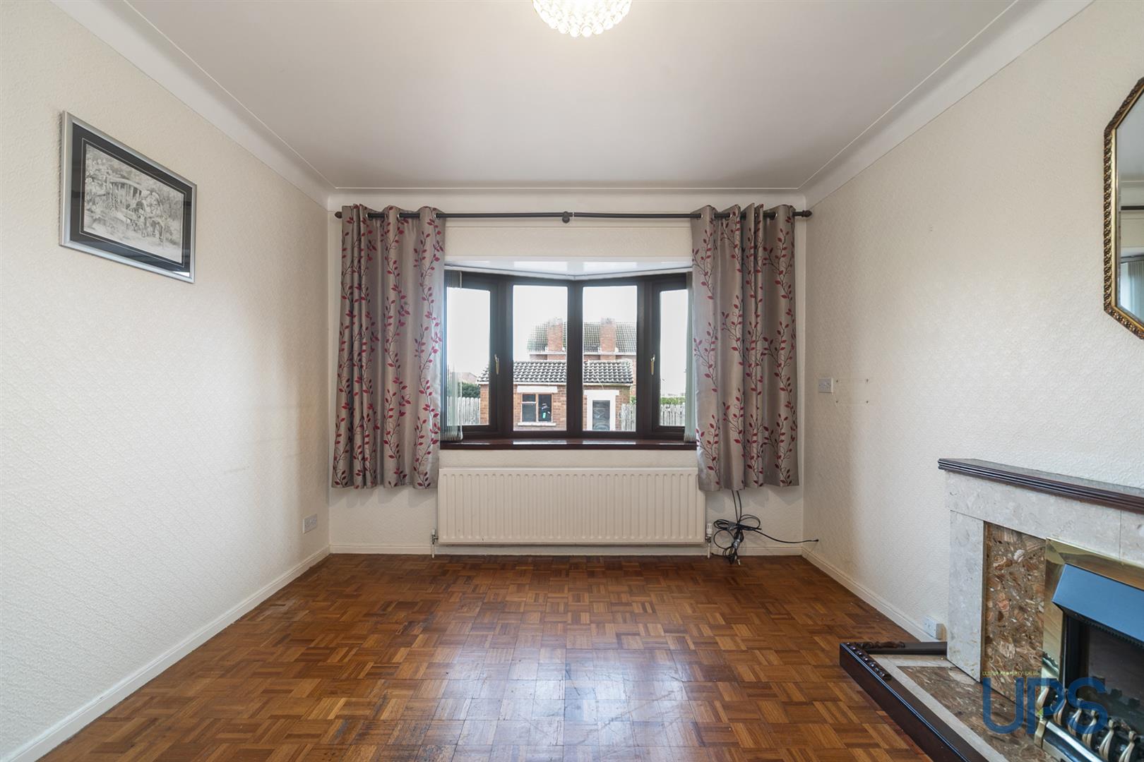 Feature fireplace, wooden effect strip floor, bay window.