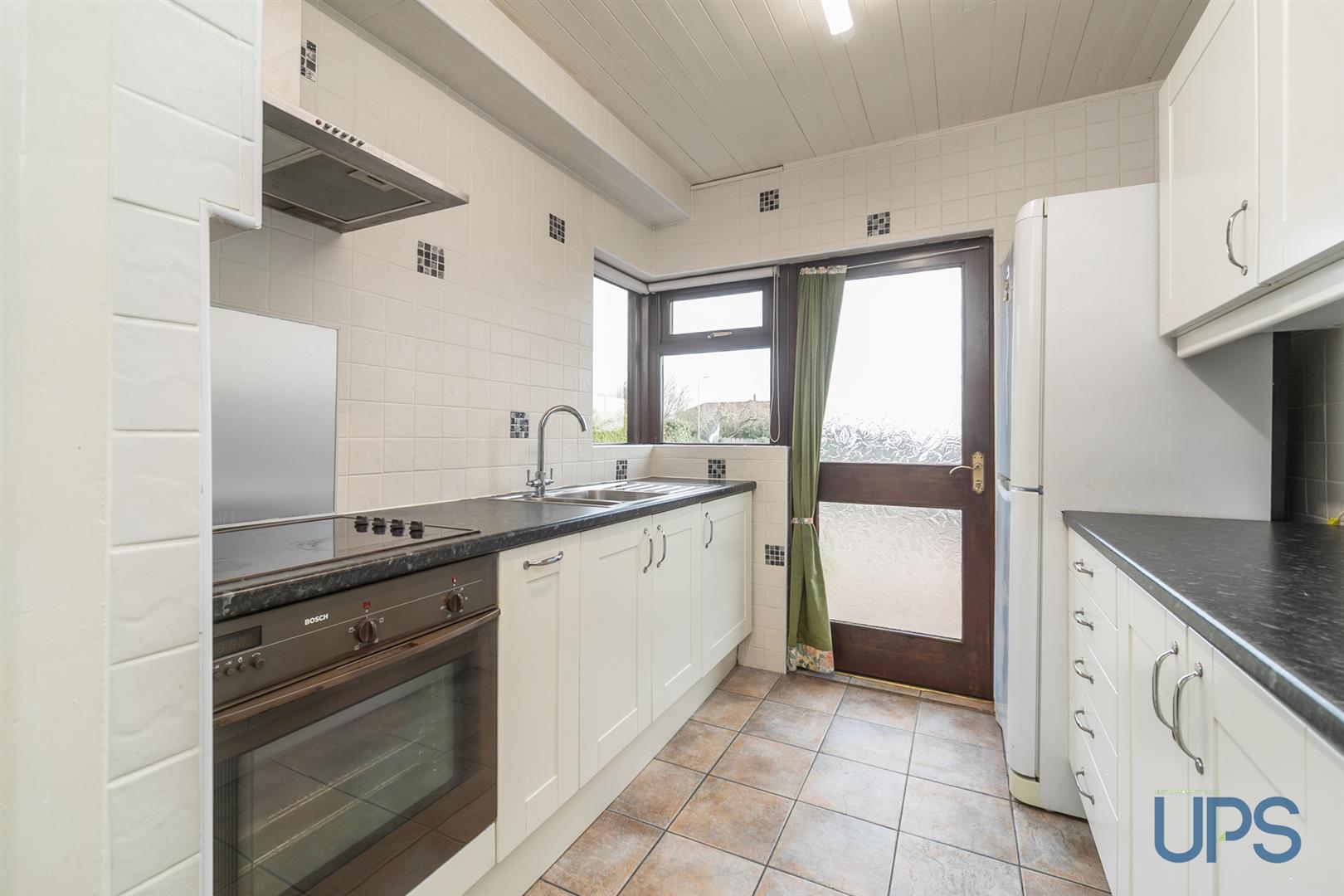 Range of high and low level units, formica work surfaces, single drainer stainless steel sink unit, tiling, ceramic tiled floor, 4 ring hob, underoven, overhead extractor hood, storage understairs, plumbed for washing machine, extractor hood, feature corner window.