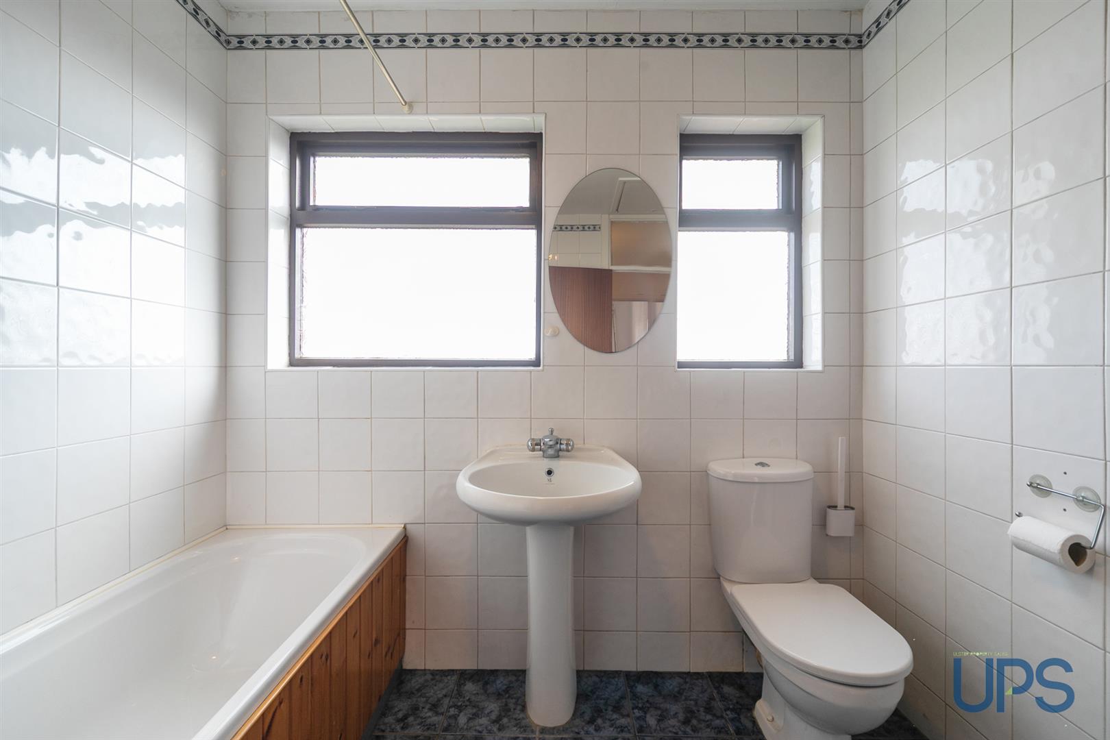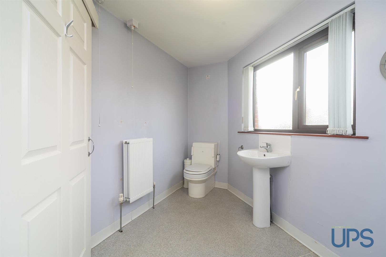 Panelled bath, electric shower unit, pedestal wash hand basin, tiling low flush w.c, tiling, ceramic tiled floor, hotpress with copper cylinder.