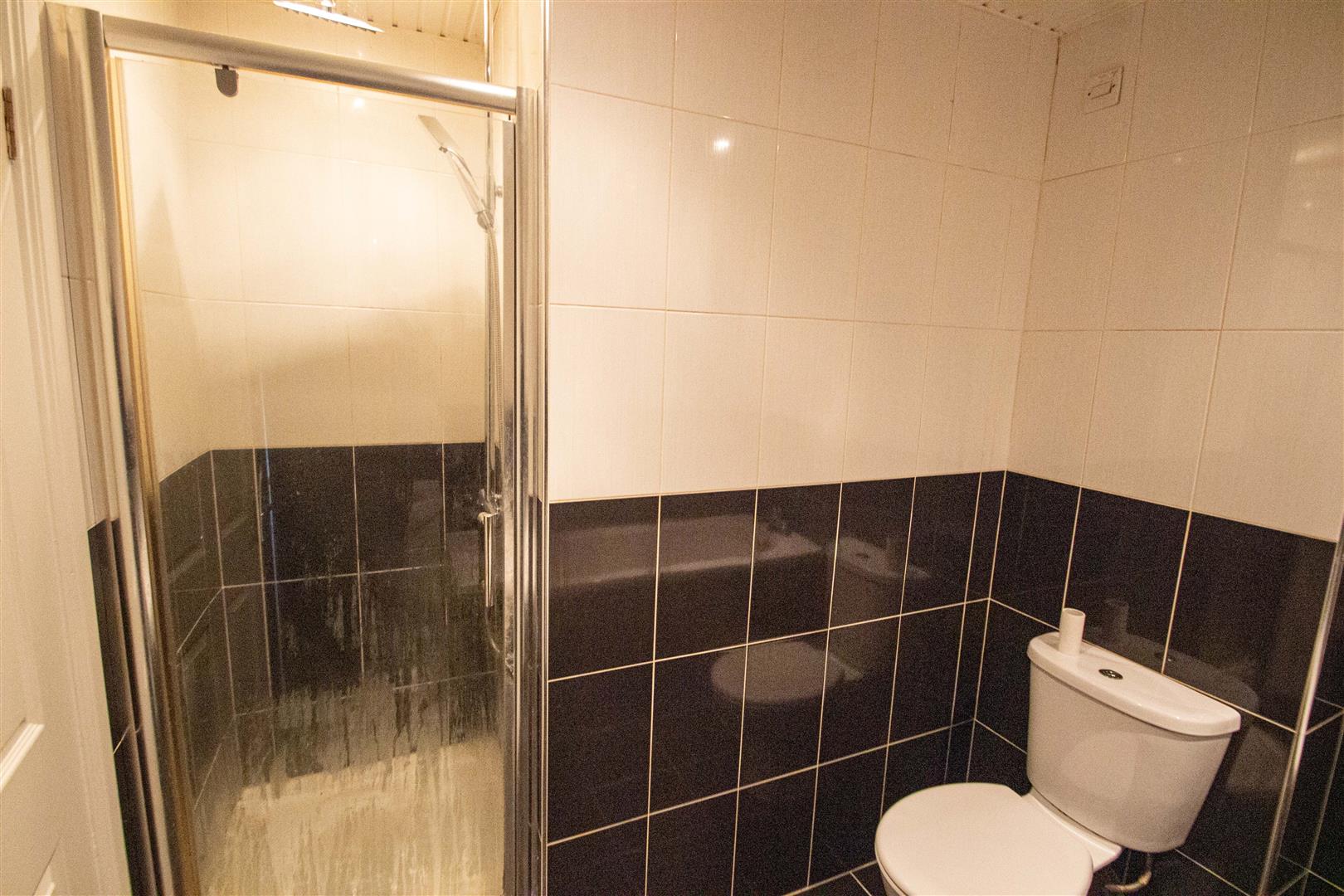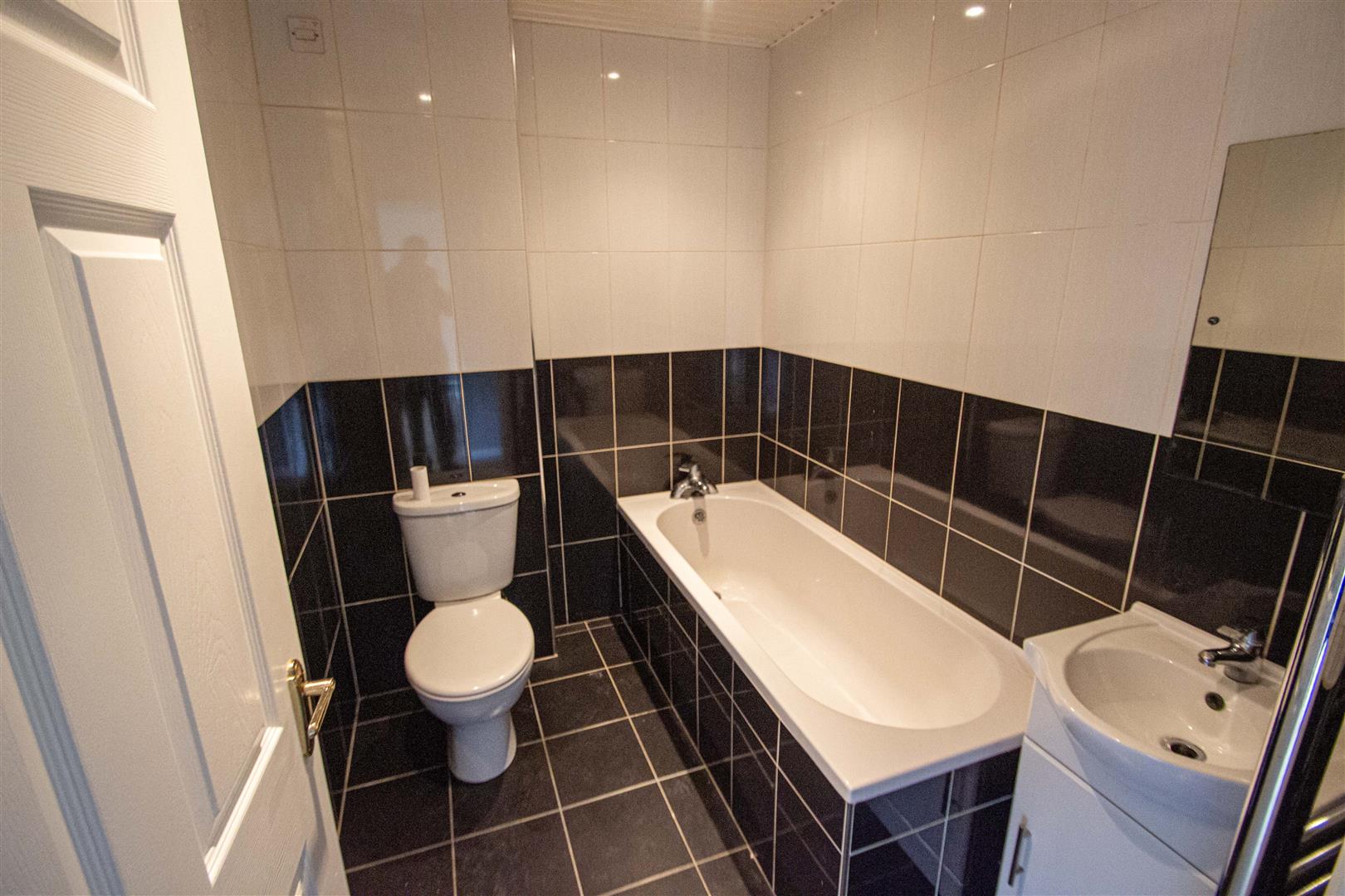 Tiled panelled bath, low flush w.c, wash hand basin and storage cabinet, chrome effect sanitary ware, chrome towel warmer, tiled walls and floor, spotlights, extractor fan, pvc stripped ceiling.