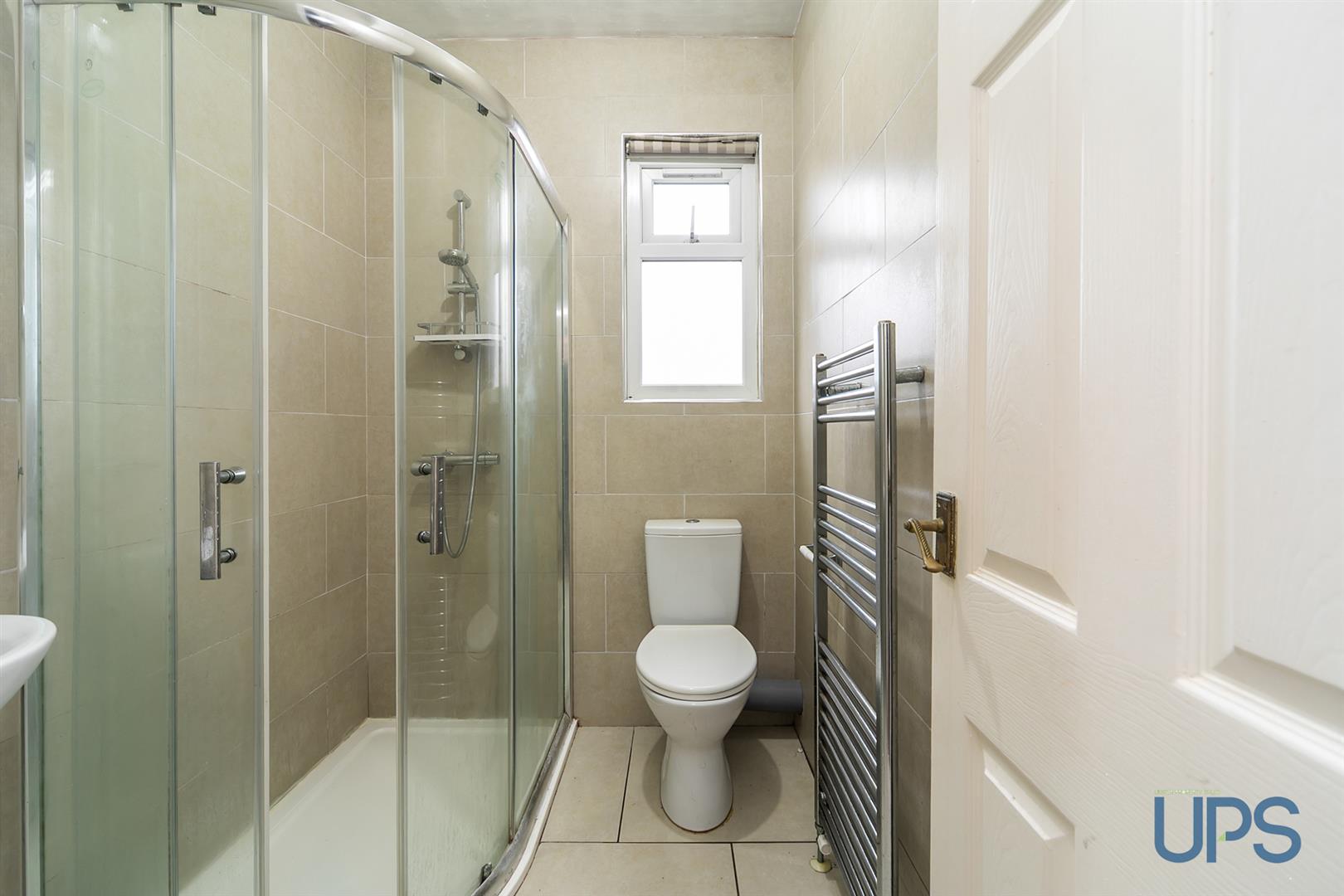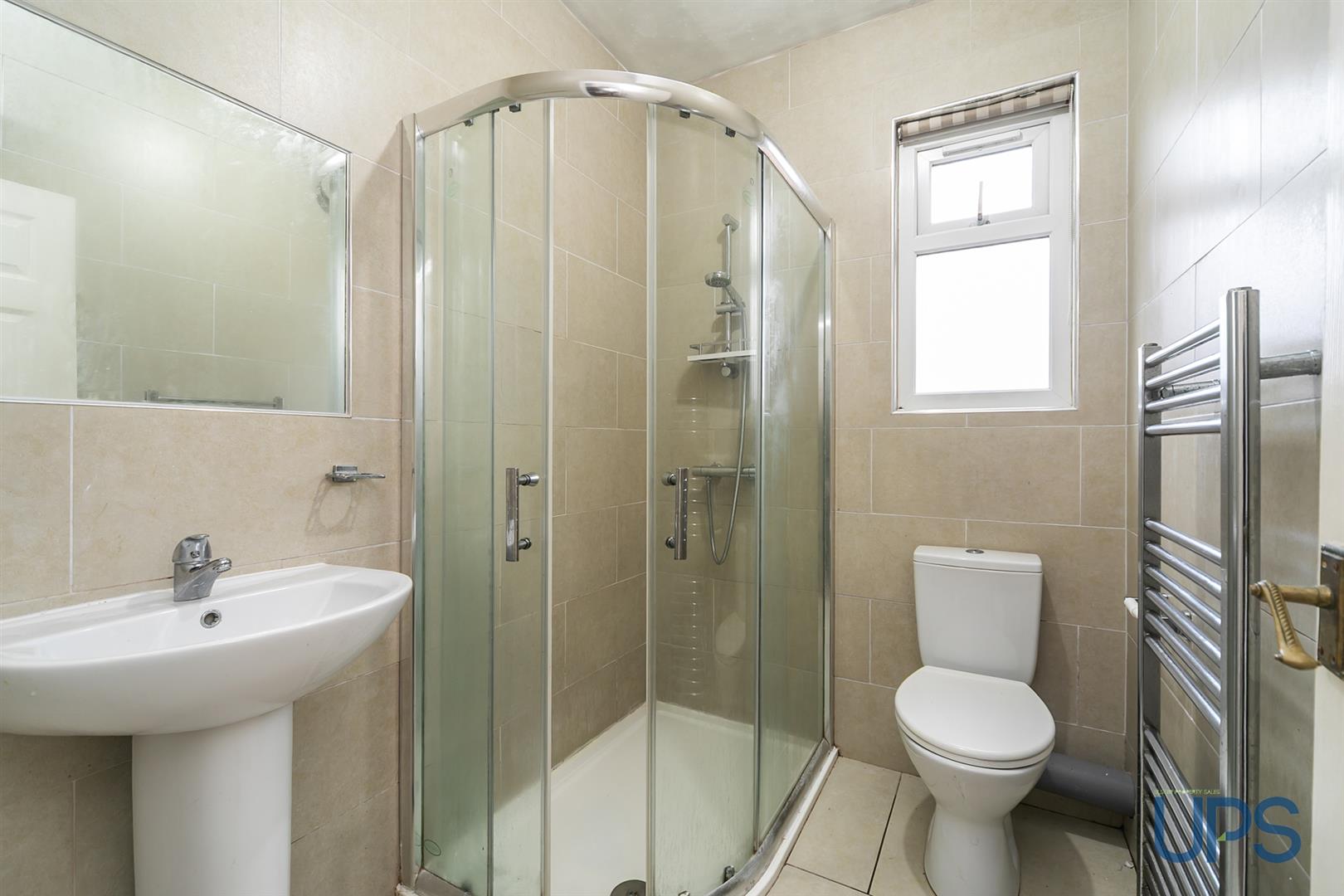 Shower cubicle, thermostatically controlled shower unit, low-flush w.c., pedestal wash hand basin, chrome effect sanitary ware, chrome effect towel warmer, extractor fan, tiled walls and floor.