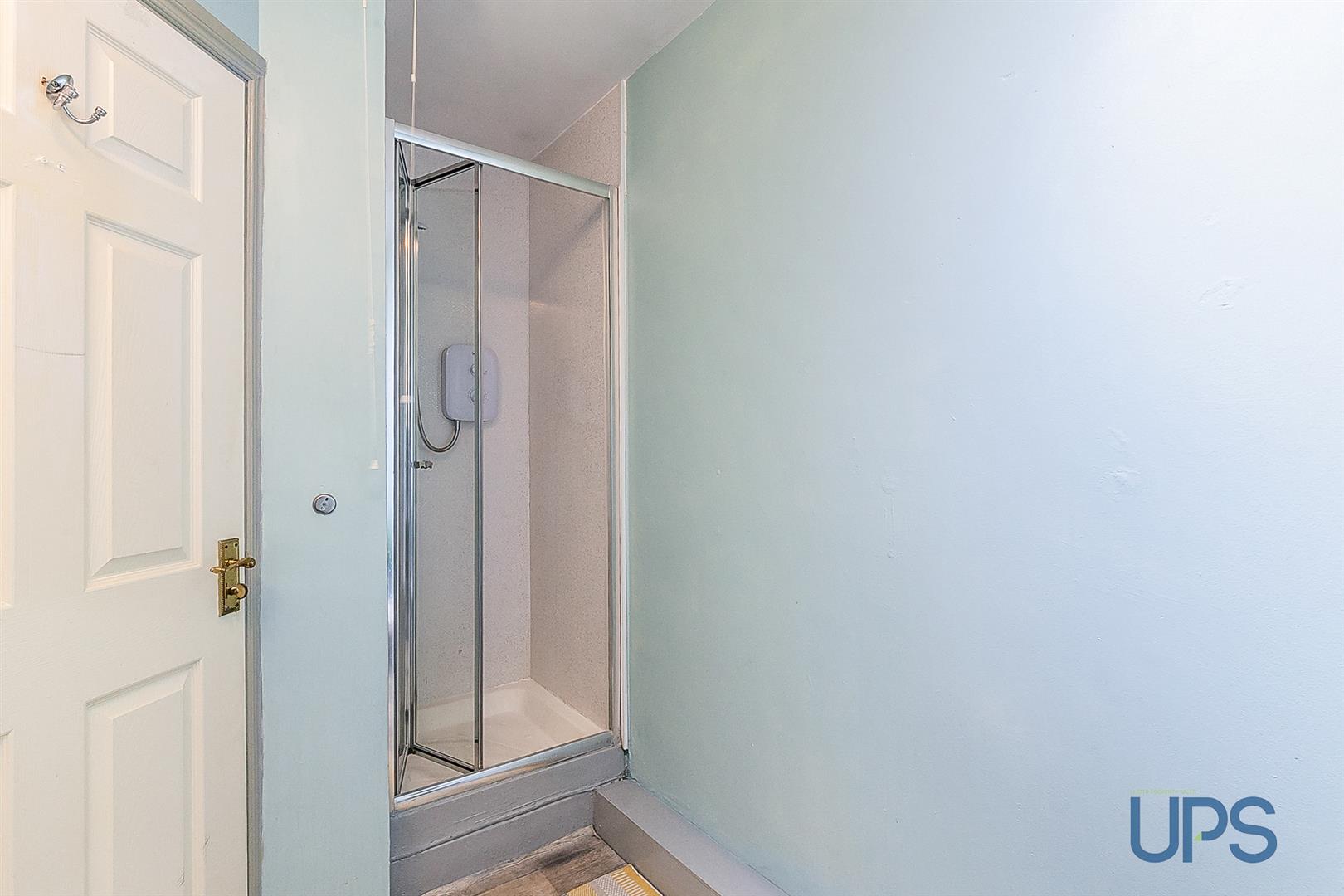 Shower cubicle, electric shower unit, low flush w.c, pedestal wash hand basin, chrome effect sanitary ware.