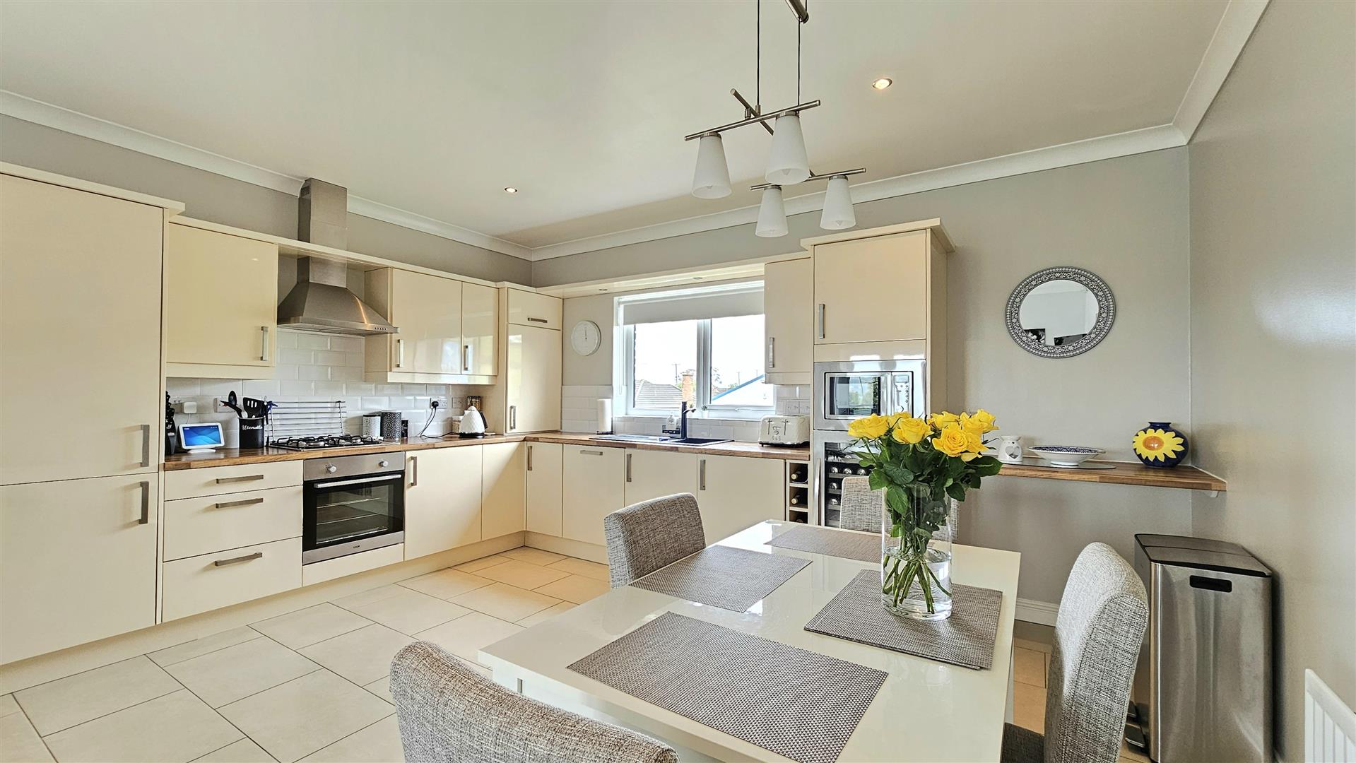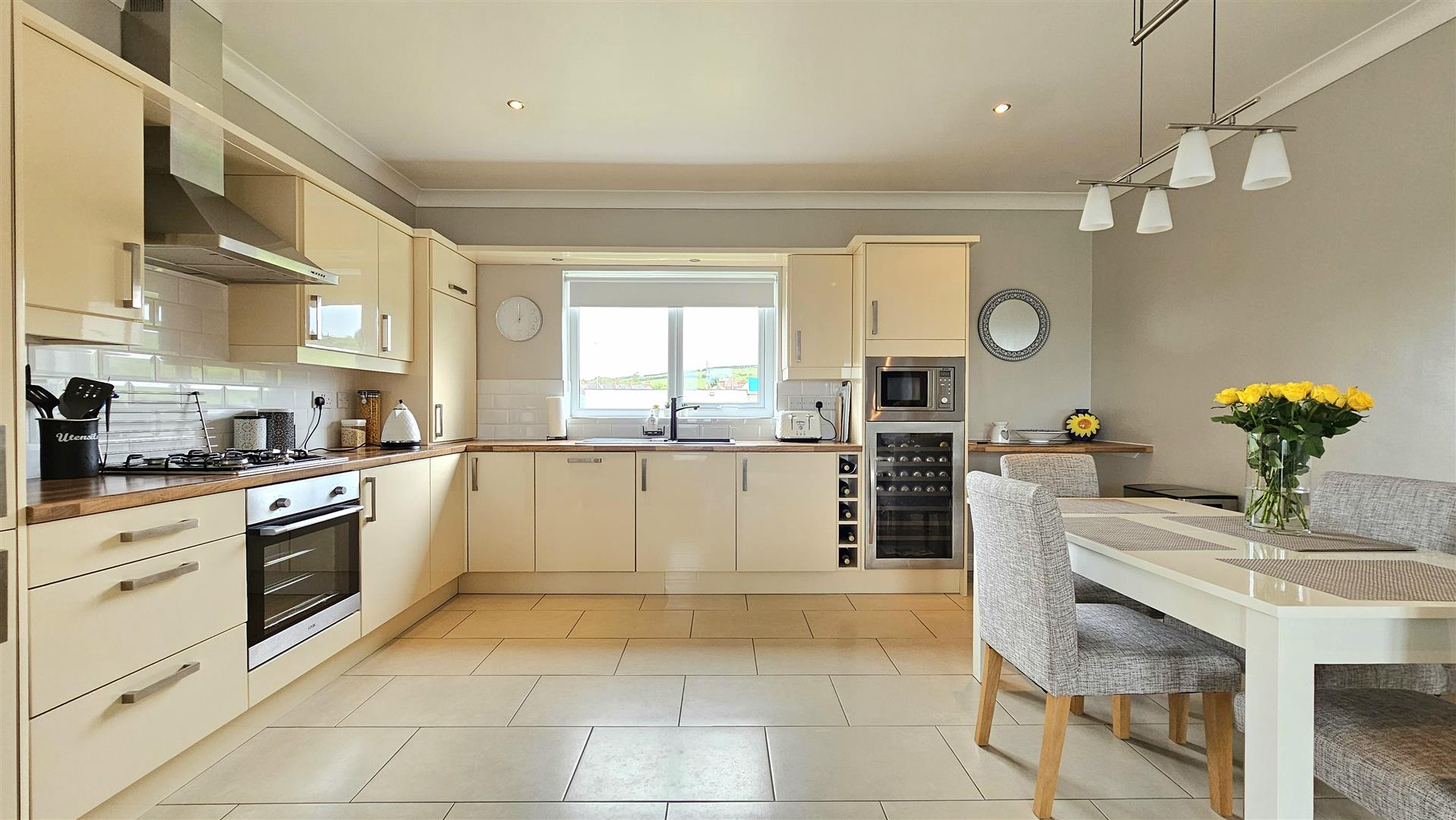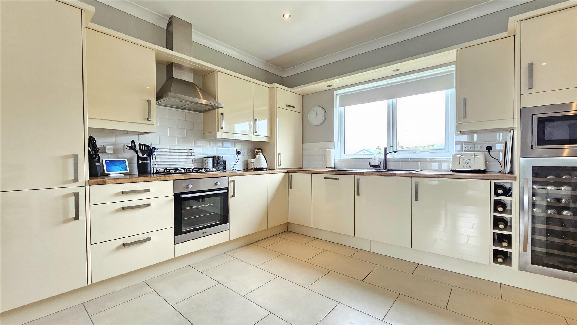 Built in oven hob and extractor, fridge freezer, dishwasher, microwave and wine cooler