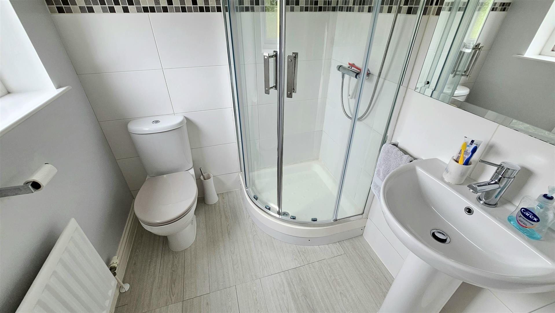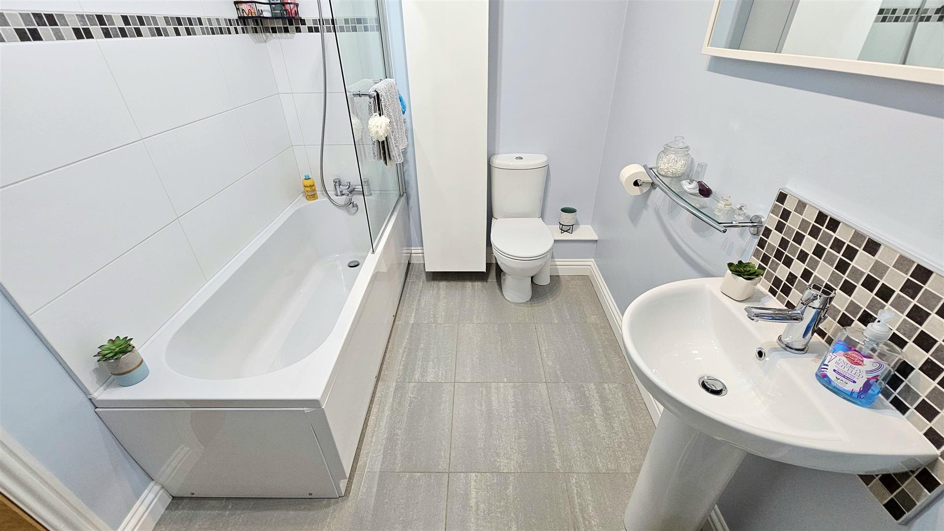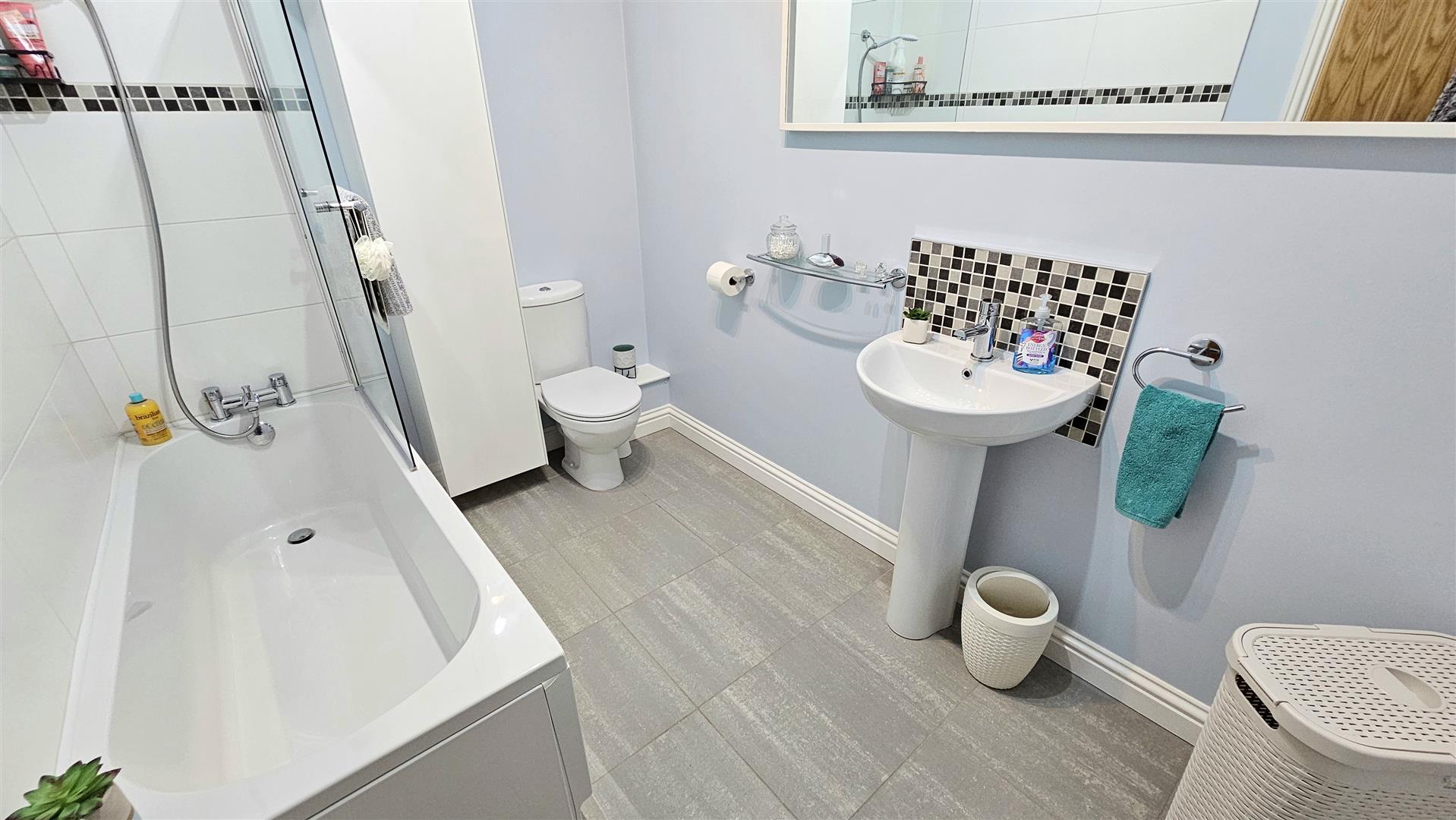 Family bathroom with white suite & shower over bath