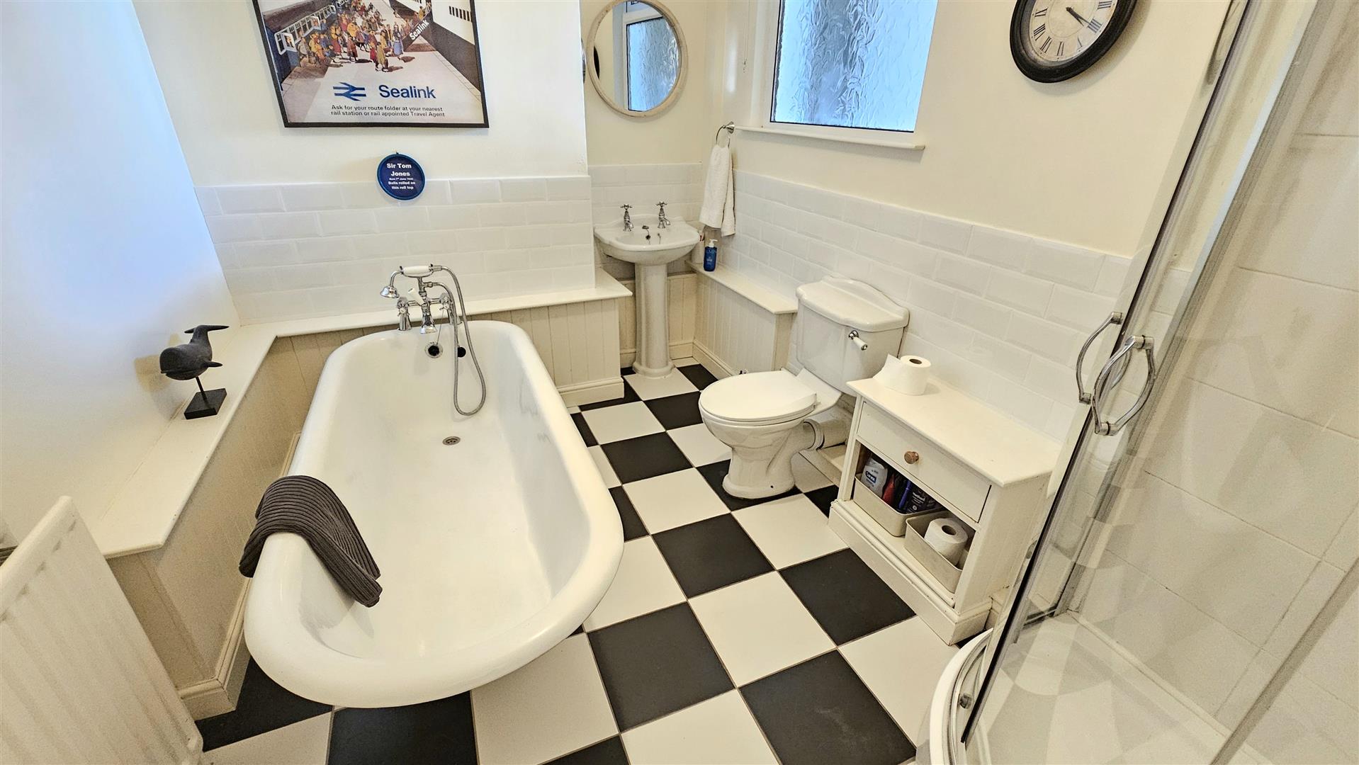 White four piece bathroom suite incorporating a free standing roll top bath & separate shower