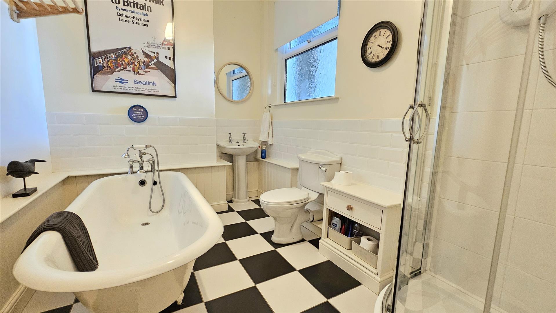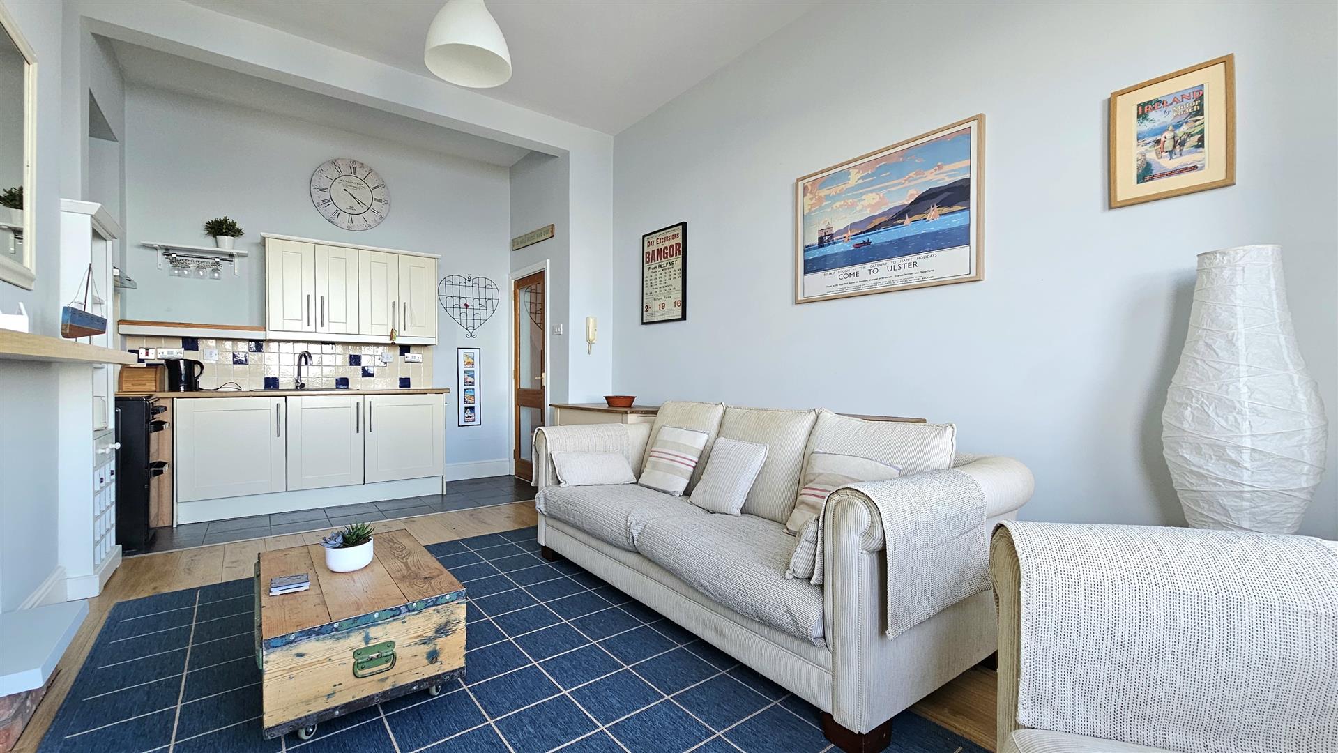 The generous lounge, measuring over eighteen feet in length is open plan to the kitchen and features high ceilings and a bay window framing views across Belfast Lough to the Copeland Islands and the Scottish Coast. The kitchen is fitted with a range of shaker style units, while the bathroom provides a touch of indulgence with a freestanding roll top bath alongside a separate shower cubicle. Two bedrooms, gas heating and double-glazing complete the apartment, with communal gardens at the rear and an off-road parking space.