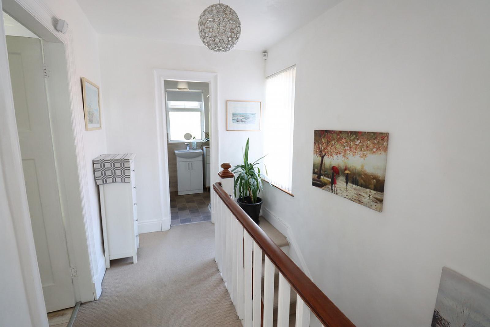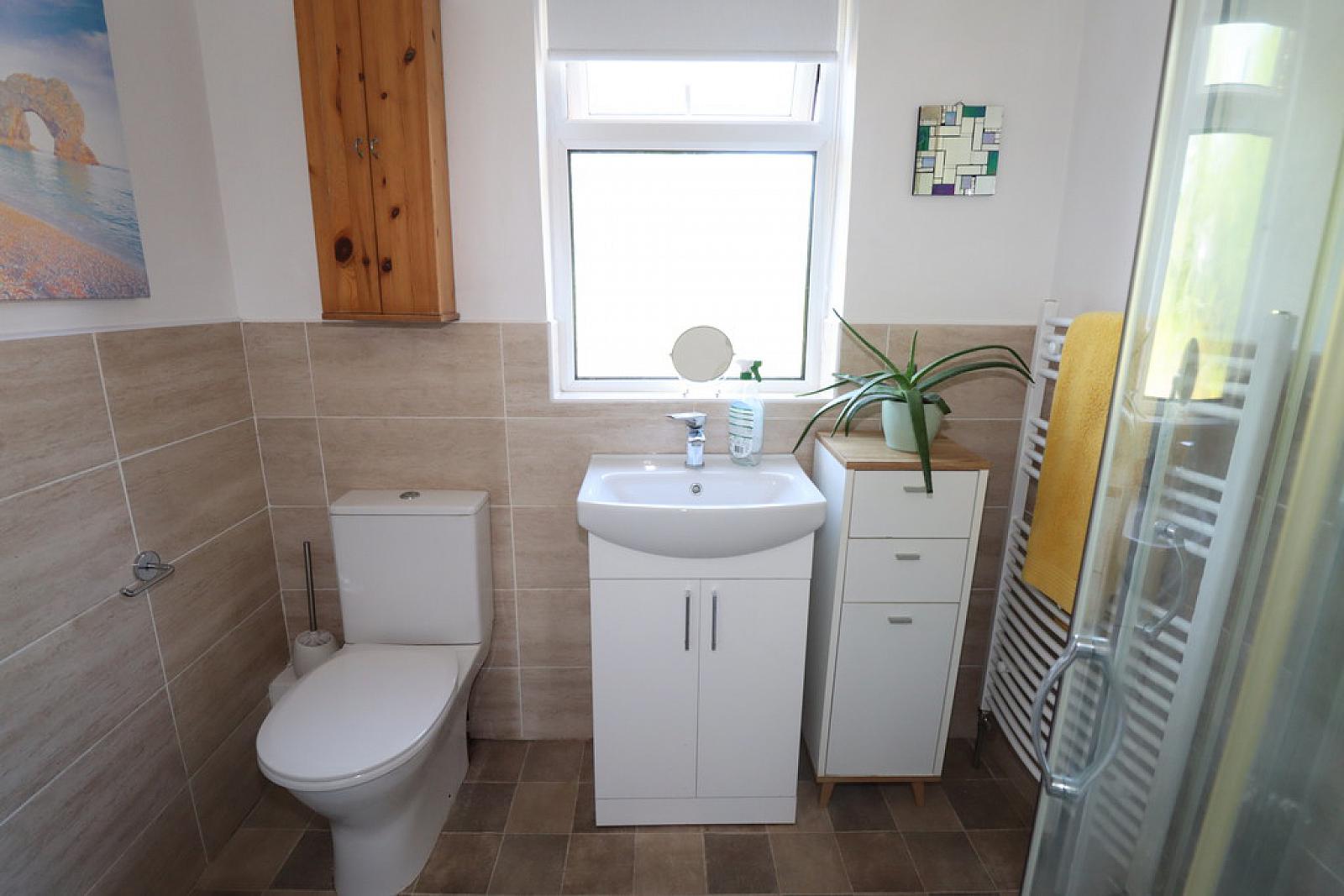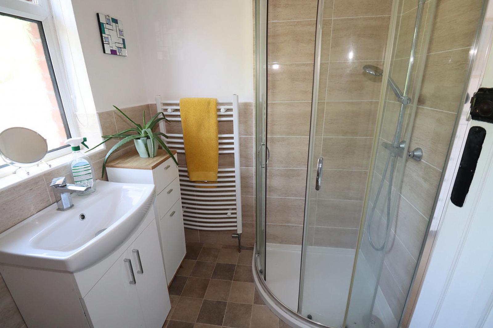 SHOWER ROOM Shower cubicle with chrome rainforest shower fitting and shower attachment. Low flush WC. Vanity unit with mixer tap. Heated towel rail. Tiling.