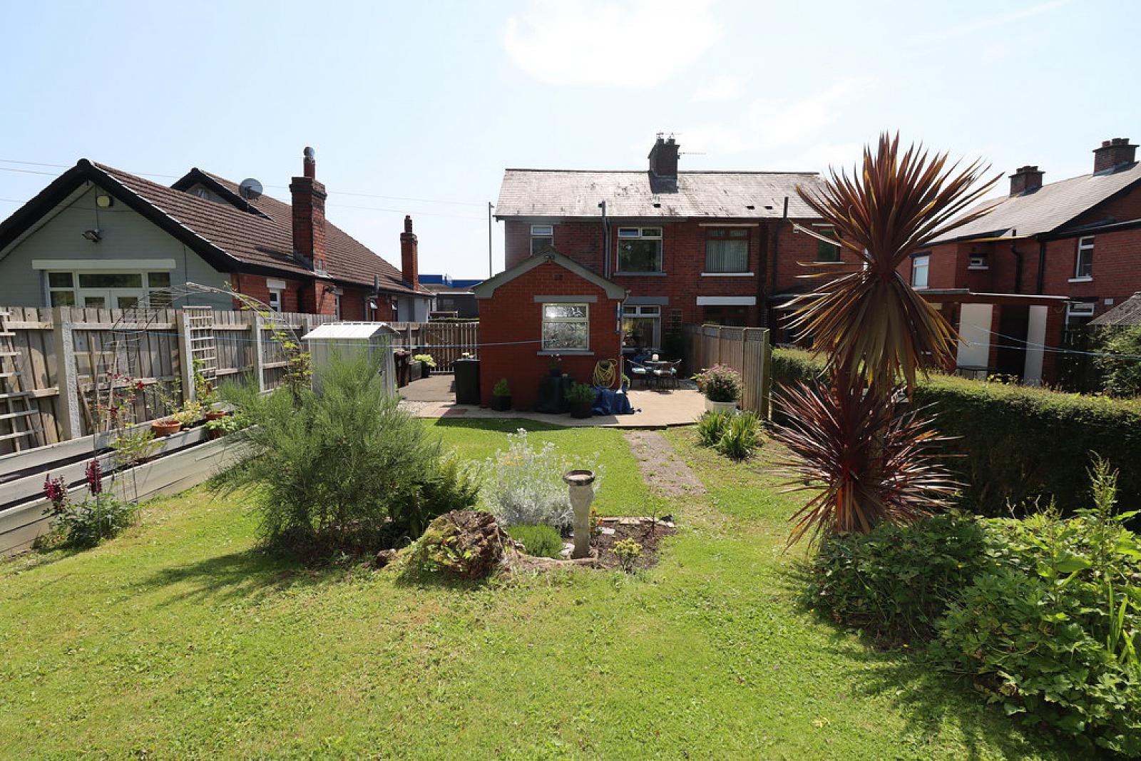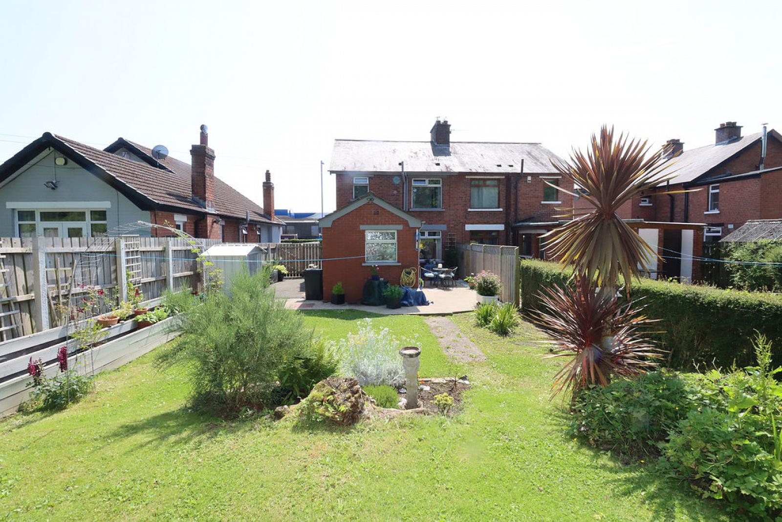 Rear garden laid to lawn. Bounded by fencing and variety of trees, plants and shrubs.