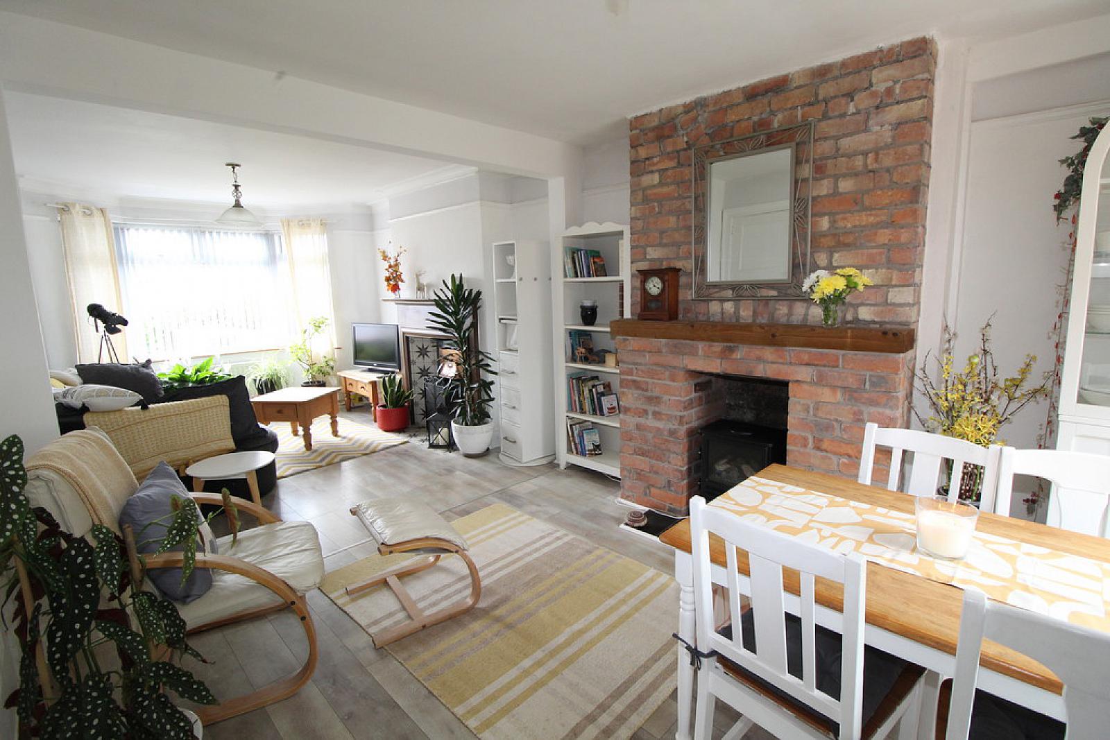 Open plan lounge/dining area with feature fireplace