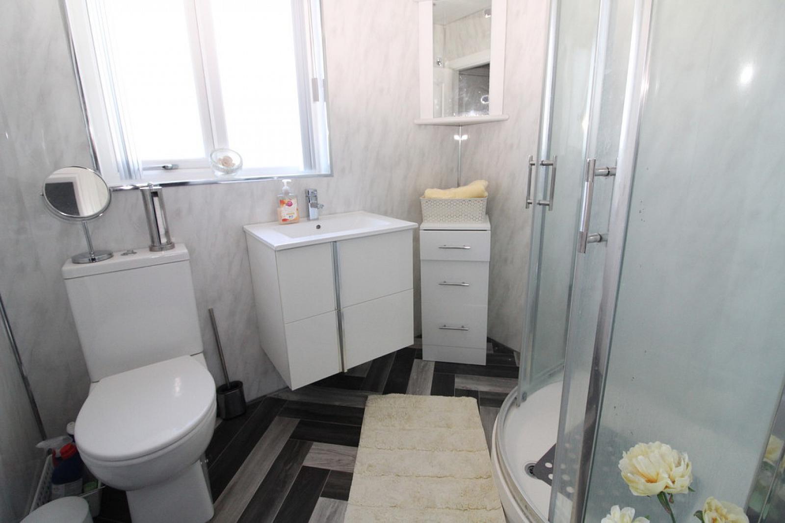 SHOWER ROOM Modern shower room glazed shower cubicle, Triton electric shower, low flush W/C, vanity unit, PVC panelled walls, tiling, downlighters, extractor fan, chrome heated towel rail