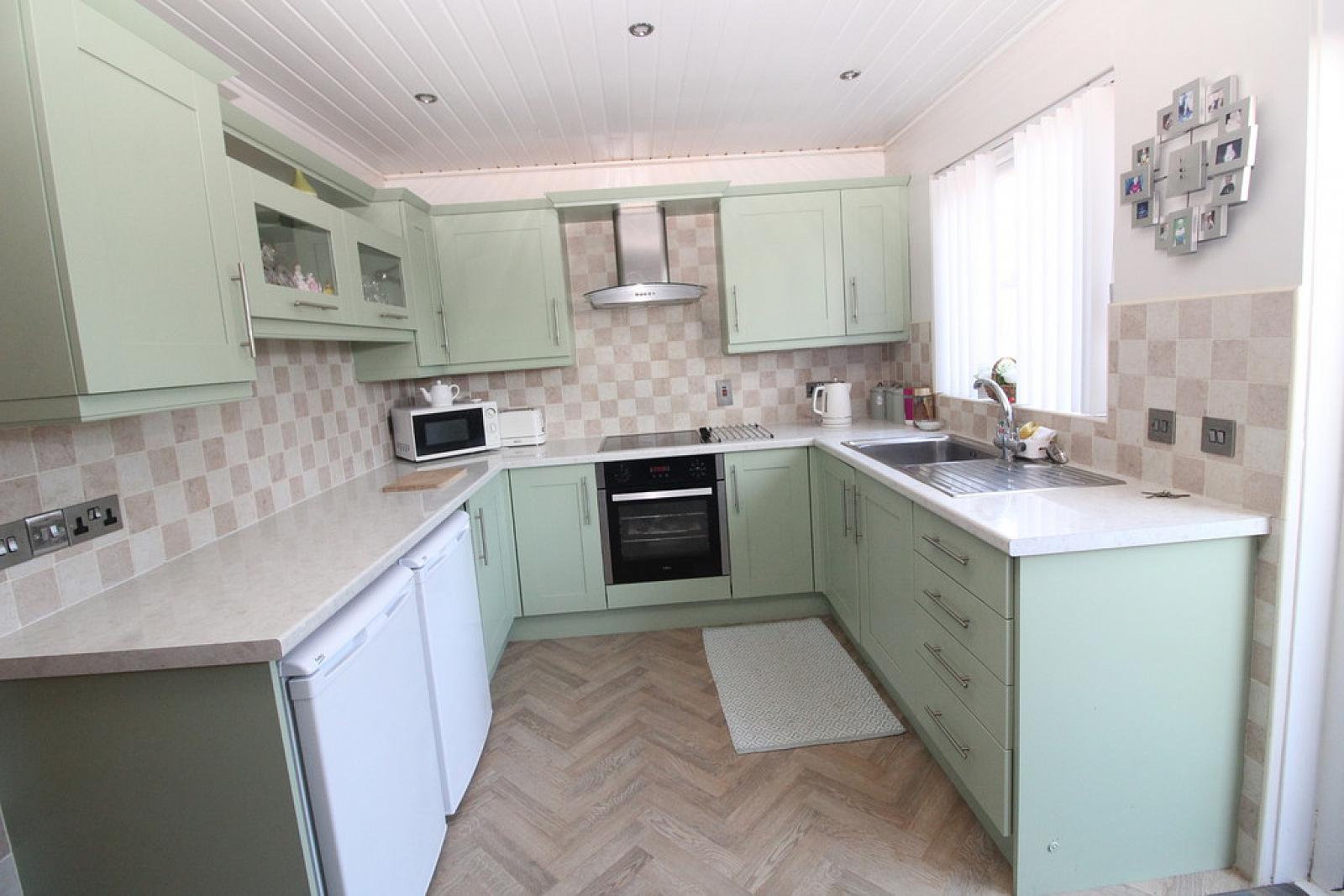 KITCHEN 15' 2" x 8' 8" (4.62m x 2.64m) Range of high and low level shaker style units, round edge worksurfaces, Single drainer stainless steel sink unit with mixer taps, built in stainless steel oven and hob unit, stainless steel extractor fan and canopy, wall tiling.