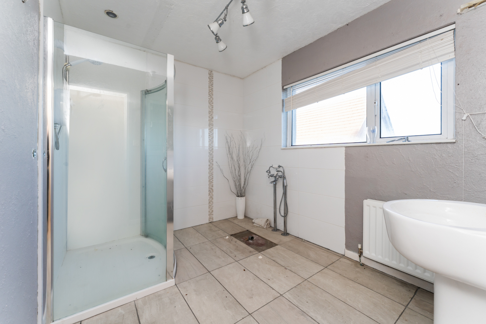 White suite comprising: Separate fully tiled shower cubicle, Aqualisa thermostatically controlled shower unit, pedestal wash hand basin, low flush WC, wall tiling, ceramic tiled floor, shaver point.