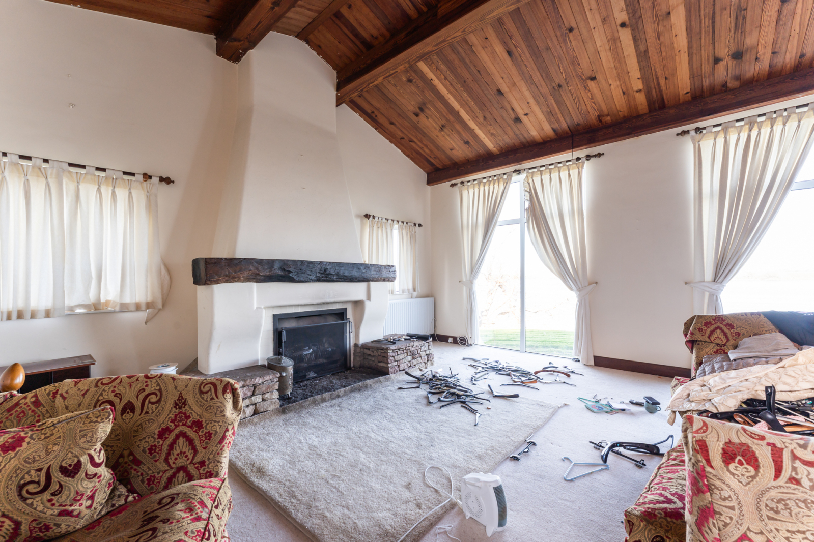Attractive fireplace, feature large sleeper mantle, open fire with dog grate, floor to ceiling windows with panoramic views over Strangford Lough and Mahee Island.