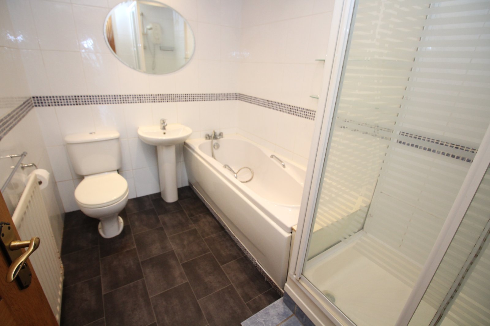 White suite comprising panelled bath, separate shower cubicle with wall mounted Mira electric shower, pedestal wash hand basin and low flush wc. Tiled walls. Pine strip ceiling with spotlights.