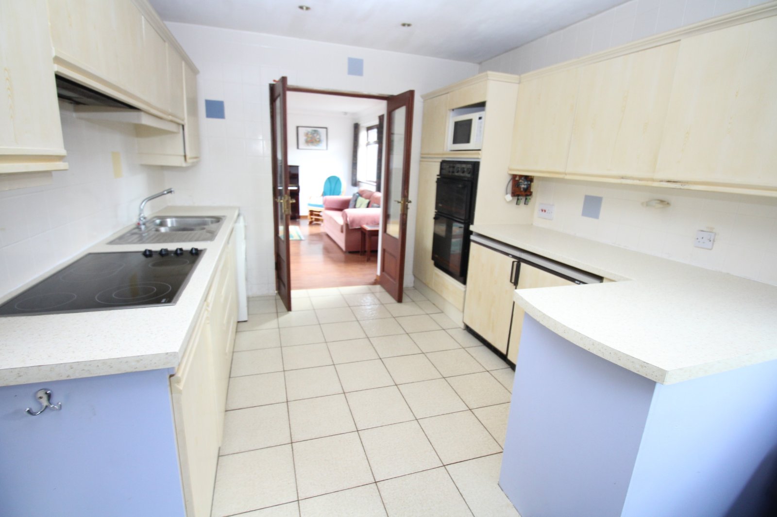 Range of fitted high and low level units. One and a half bowl stainless steel sink unit with mixer tap. Built in double oven. Part tiled walls and tiled floor. Spotlights. Double doors to lounge: