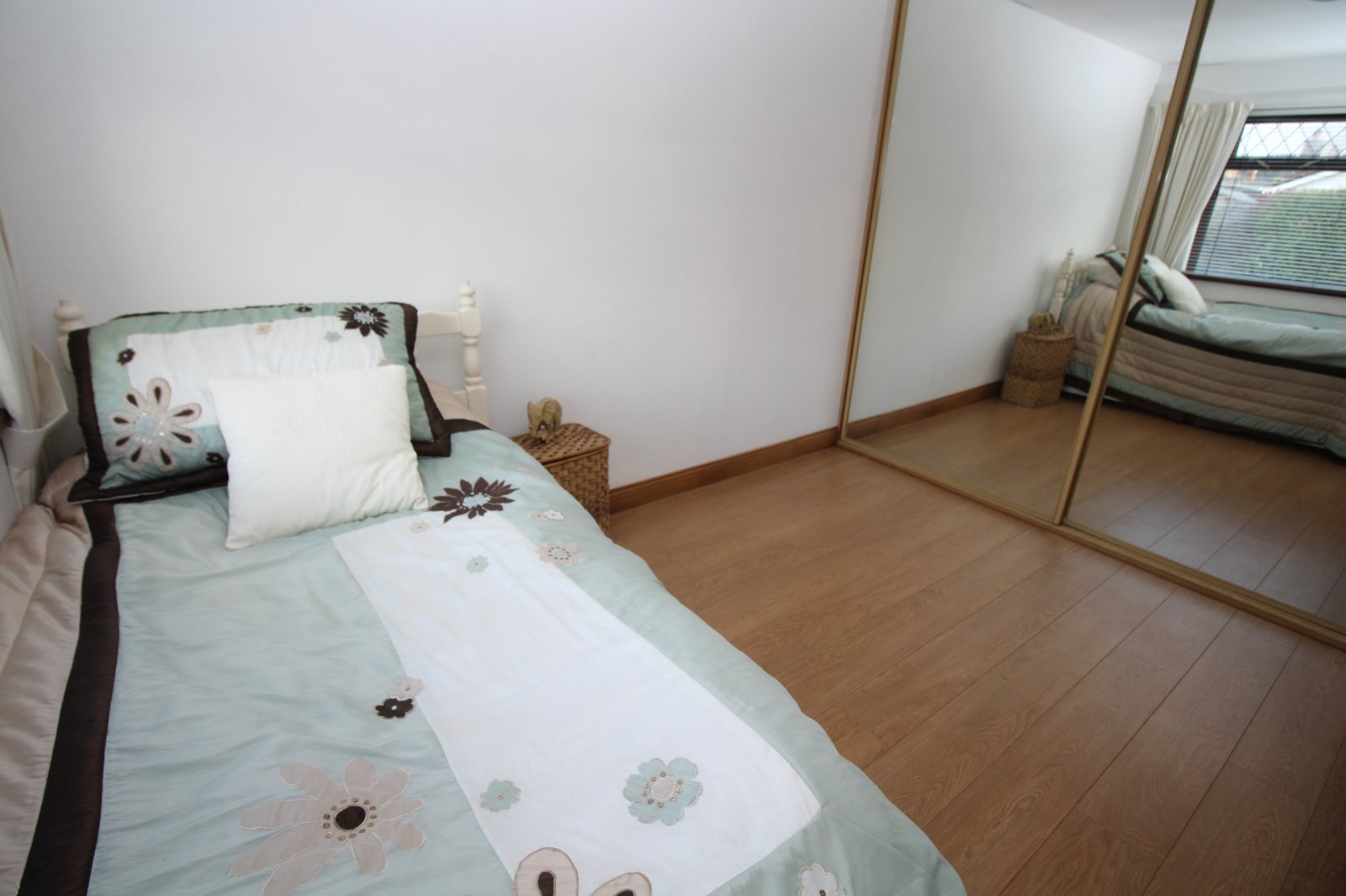 Range of fitted robes with mirrored sliding doors. Laminate wooden floor.